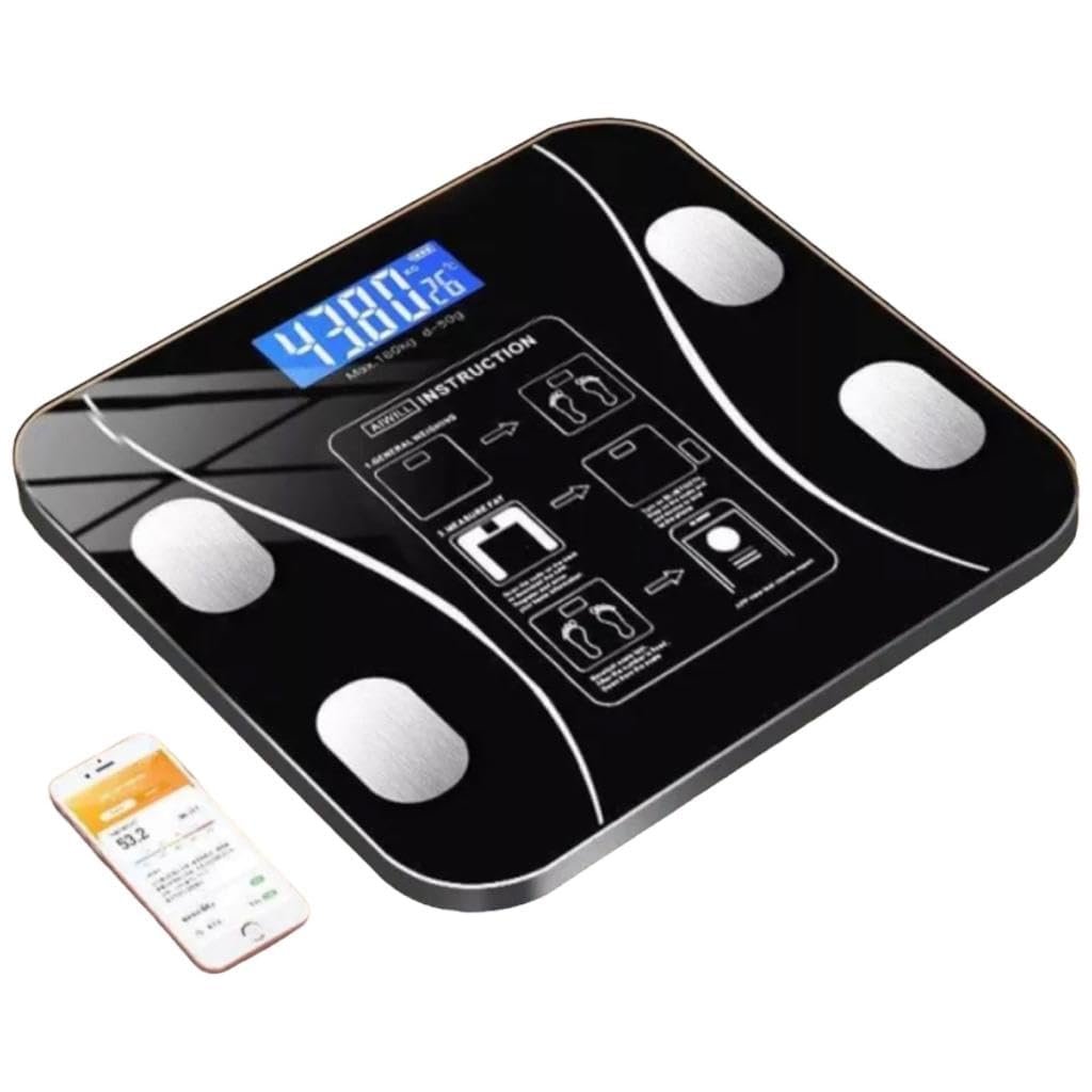 Tipo: balança corporal com bioimpedância. Funções: medição de gordura corporal, IMC, massa muscular, água corporal, metabolismo basal, massa óssea, proteína, entre outros. Compatibilidade: Android e iOS (app gratuito). Capacidade máxima: 140 kg. Display: visor LCD com luz de fundo azul. Material da plataforma: vidro temperado. Desligamento automático: sim. Dimensões: 26 x 26 x 2,5 cm (L x C x A). Peso: aproximadamente 1,2 kg. Cor: preta. Itens inclusos: 1 balança digital, 1 manual de instruções.