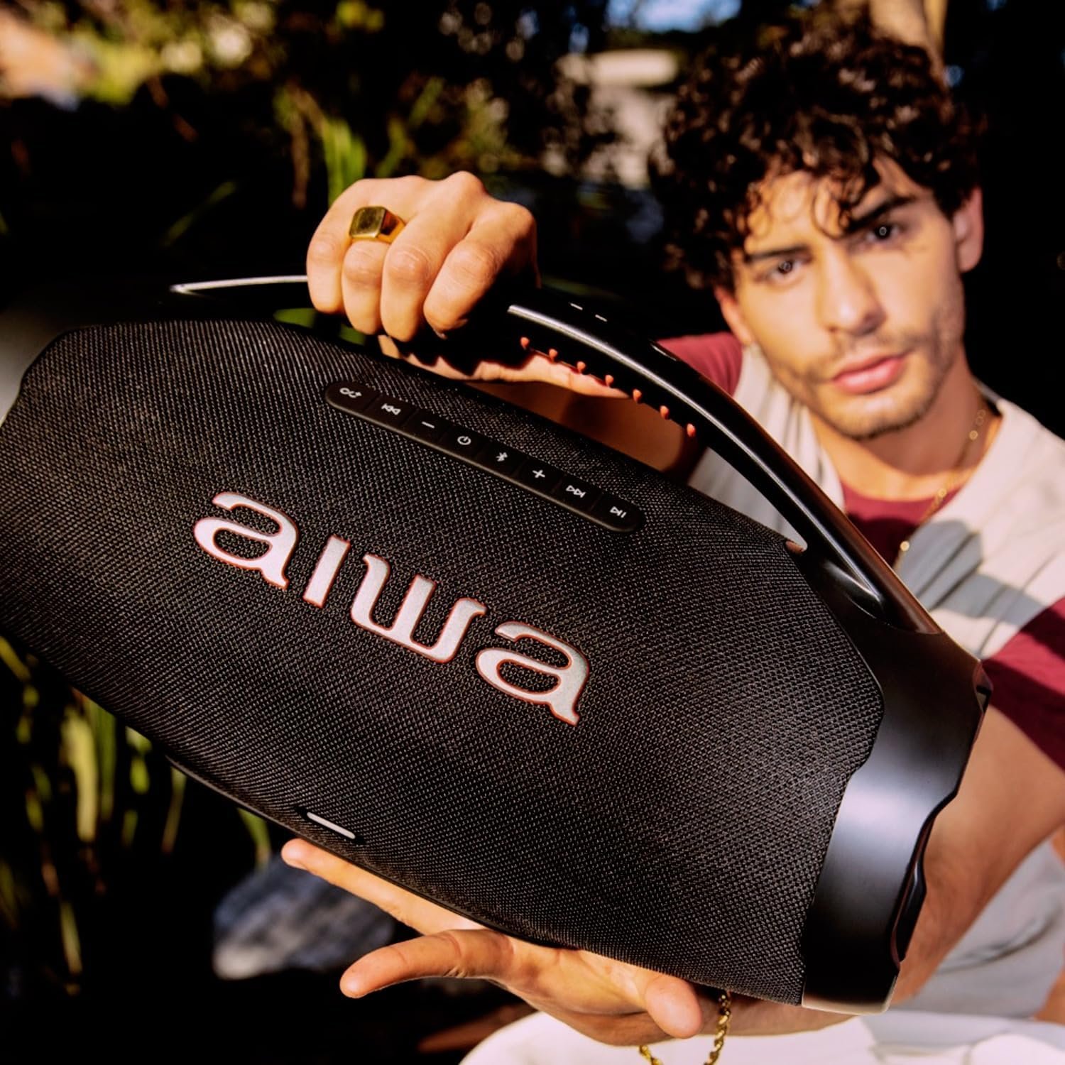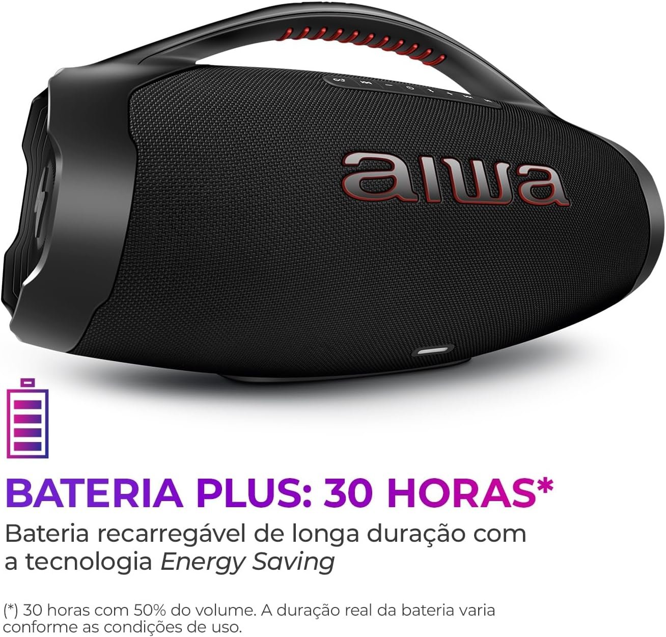 Caixa de Som Boombox Plus AIWA BBS-01-B 200W Bluetooth 5.3-200W RMS – 30 Horas de Bateria – Resistente à Poeira e Água – Preto