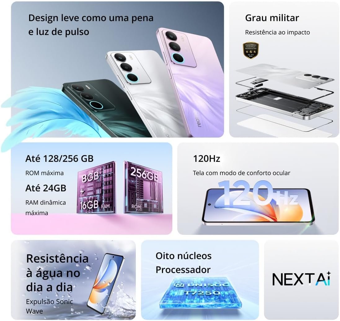 - Conectividade e resistência: NFC, 4G, Wi-Fi 5, Bluetooth 5.2, GPS, entrada P2 3,5mm; proteção contra água e poeira (IP54/IP64), corpo reforçado, função SonicWave Water Ejection