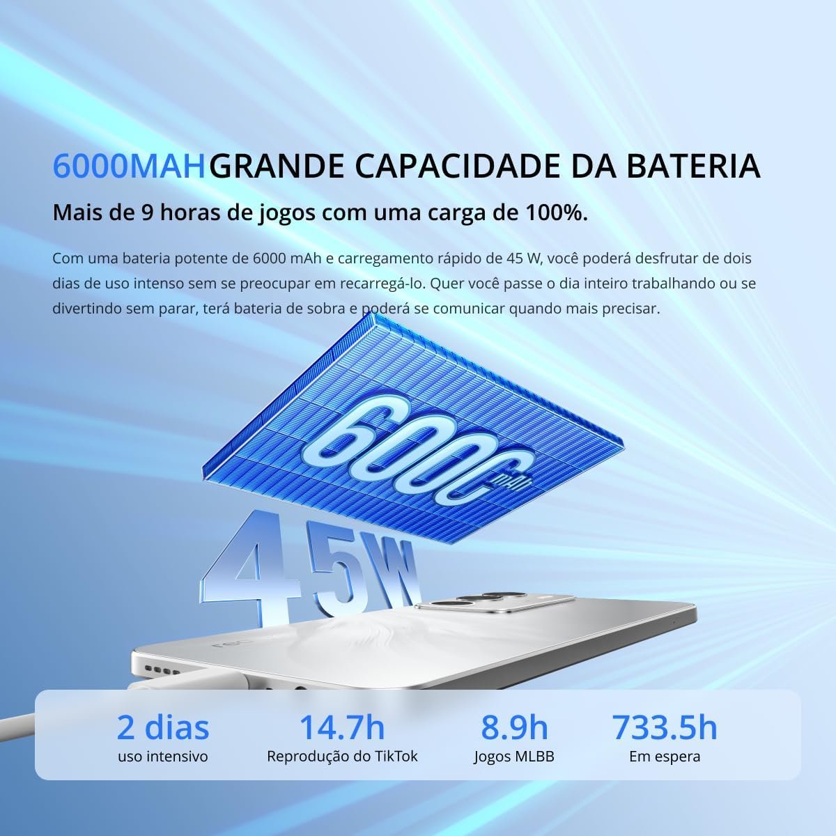 - Bateria: 6000mAh com carregamento rápido 45W SUPERVOOC (0–50% em até 36 min)