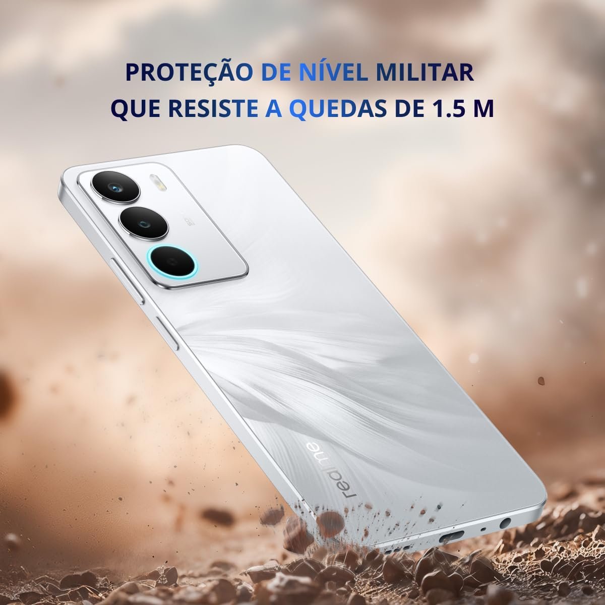 Bateria de 6000mAh com carregamento rápido 45W SUPERVOOC (0–50% em até 36 minutos). Conectividade inclui NFC para pagamentos por aproximação, 4G, Wi-Fi 5, Bluetooth 5.2, GPS e entrada P2 3,5mm. Resistência contra água e poeira (IP54/IP64), corpo reforçado e função SonicWave Water Ejection.
