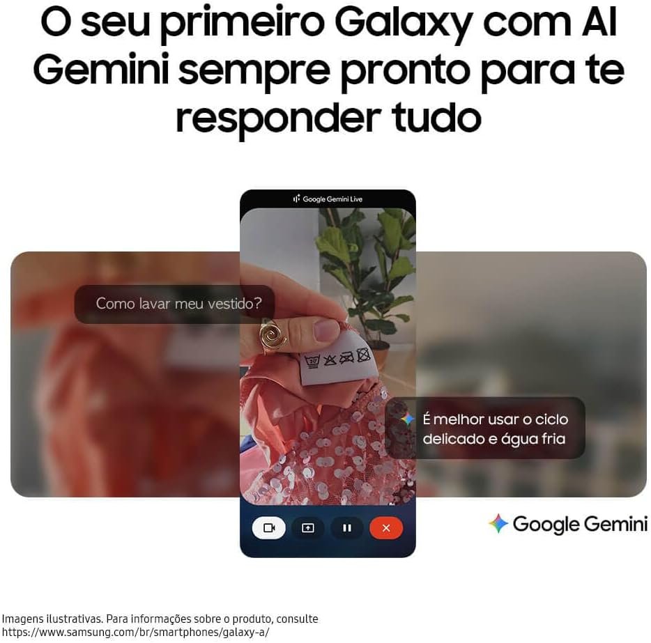 A bateria tem capacidade de 5.000mAh e o aparelho suporta Dual Chip. Recursos adicionais incluem Galaxy AI Gemini Live e Circule para pesquisar, além do Samsung Wallet para pagamentos com segurança e comodidade.