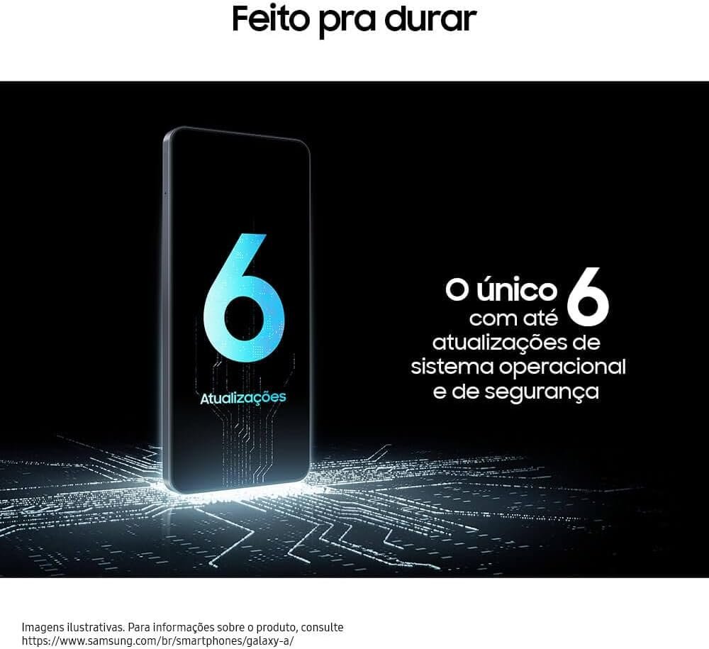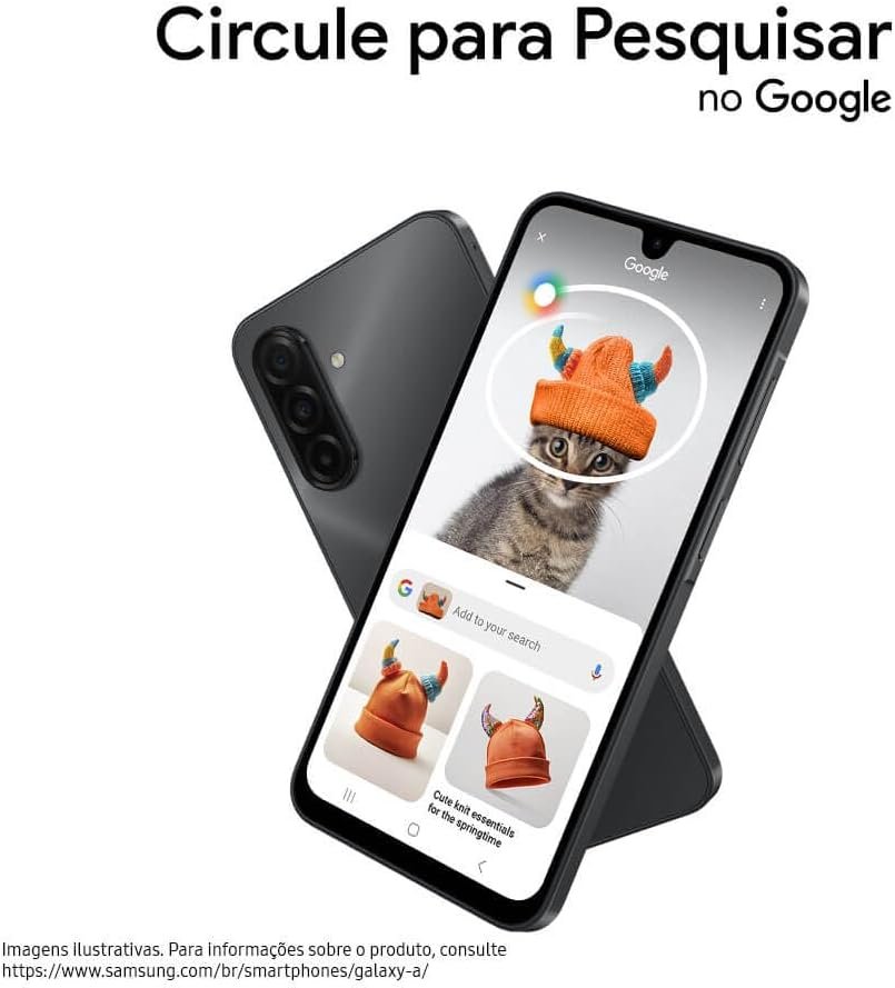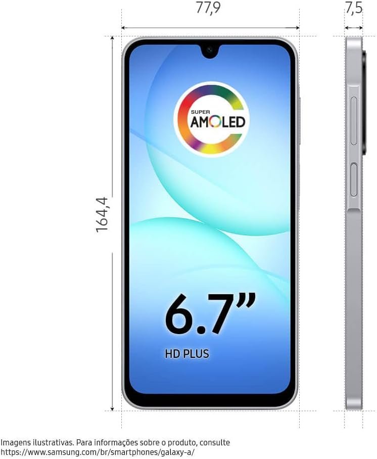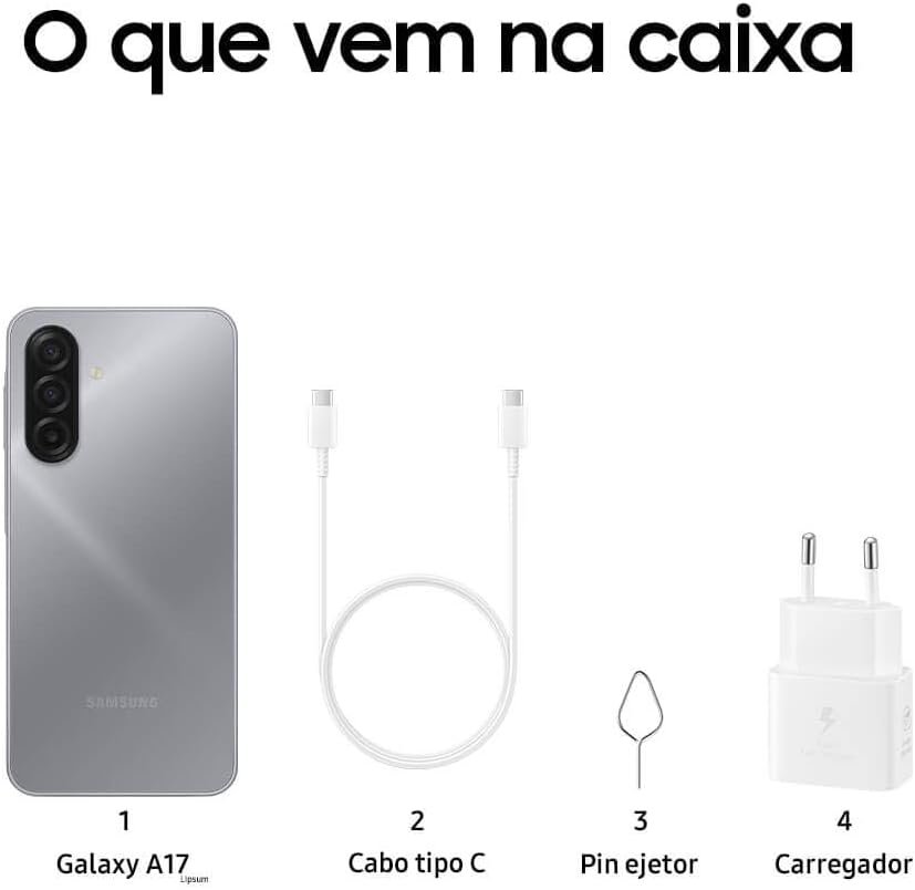 Samsung Galaxy A17 com 128GB de armazenamento interno, 4GB RAM e 4GB RAM Plus. Processador Helio G99 Octa-Core de 6nm. Tela Super AMOLED de 6,7″ resistente. Câmera tripla traseira de até 50MP com estabilização óptica e câmera frontal de 13MP. Sistema Android 15 com 6 atualizações. Certificação IP54 para resistência à água e poeira. Bateria de 5.000mAh. Dual Chip. Recursos incluem IA integrada, NFC, Samsung Wallet, Galaxy AI Gemini Live e função Circule para pesquisar.
