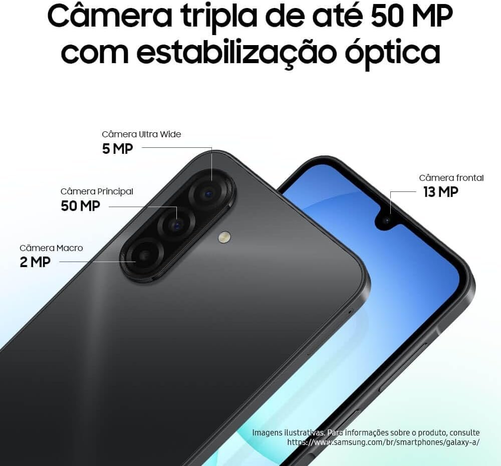 O Samsung Galaxy A17 possui 4GB de RAM, 128GB de armazenamento, processador Helio G99 Octa-Core, câmera tripla de até 50MP com estabilização óptica e tela Super AMOLED de 6,7″. Conta com Android 15, resistência IP54, bateria de 5.000mAh, NFC, Samsung Wallet e recursos de inteligência artificial integrados.