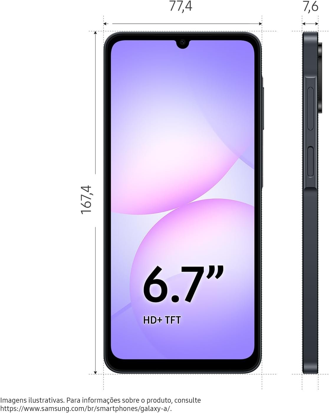 O Galaxy A07 oferece o processador Mediatek Helio G99 de 6nm, com 4GB de RAM + 4GB de RAM Plus (virtual) e 128GB de armazenamento interno. Sua câmera dupla de até 50MP trabalha com uma câmera de profundidade, além da frontal de 8MP. Conta com proteção IP54 contra água e poeira, tela de 6,7″ HD+ com vidro temperado e taxa de atualização de 90 Hz, acabamento fino de 7,6mm e 184g, e bateria de 5000 mAh. O processador tem performance 84% superior à versão anterior (G85).