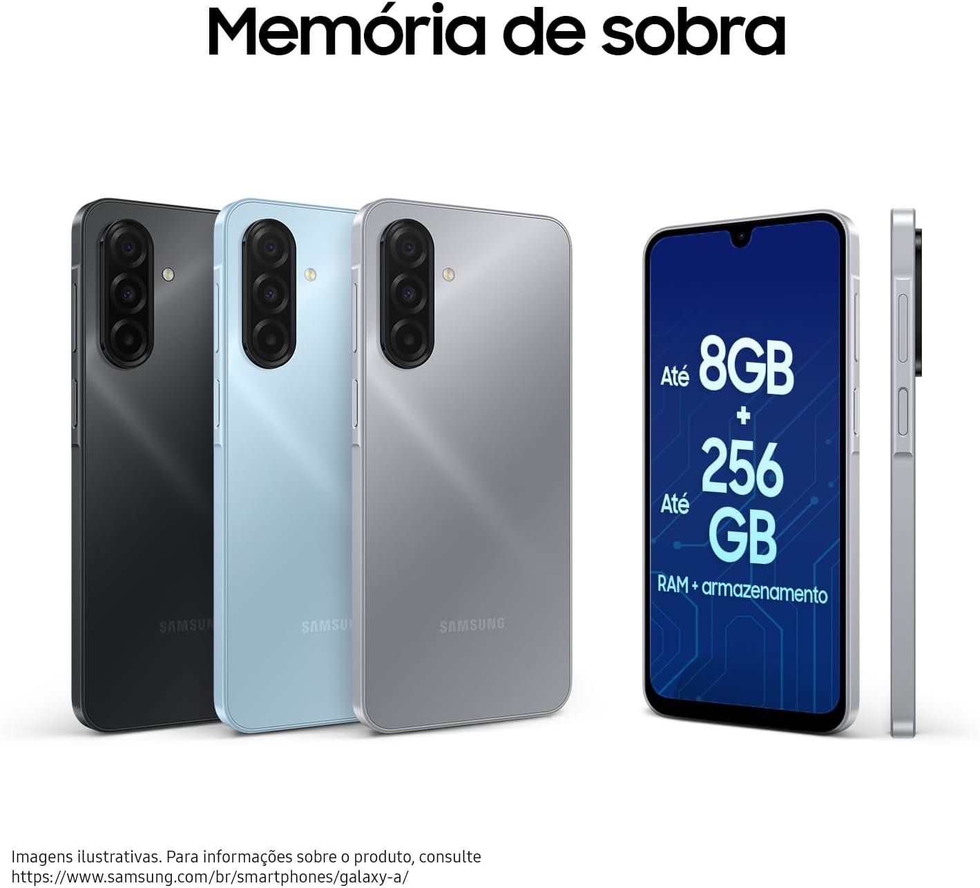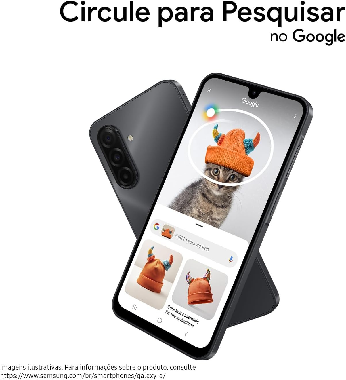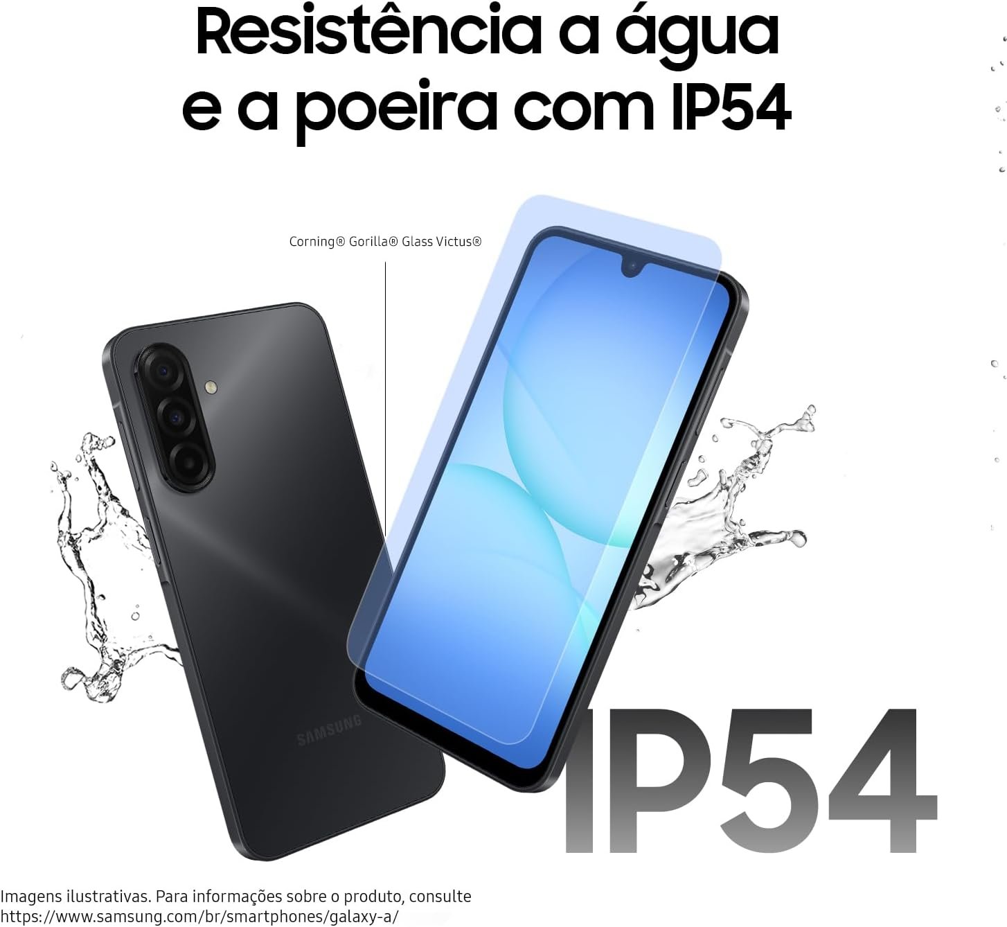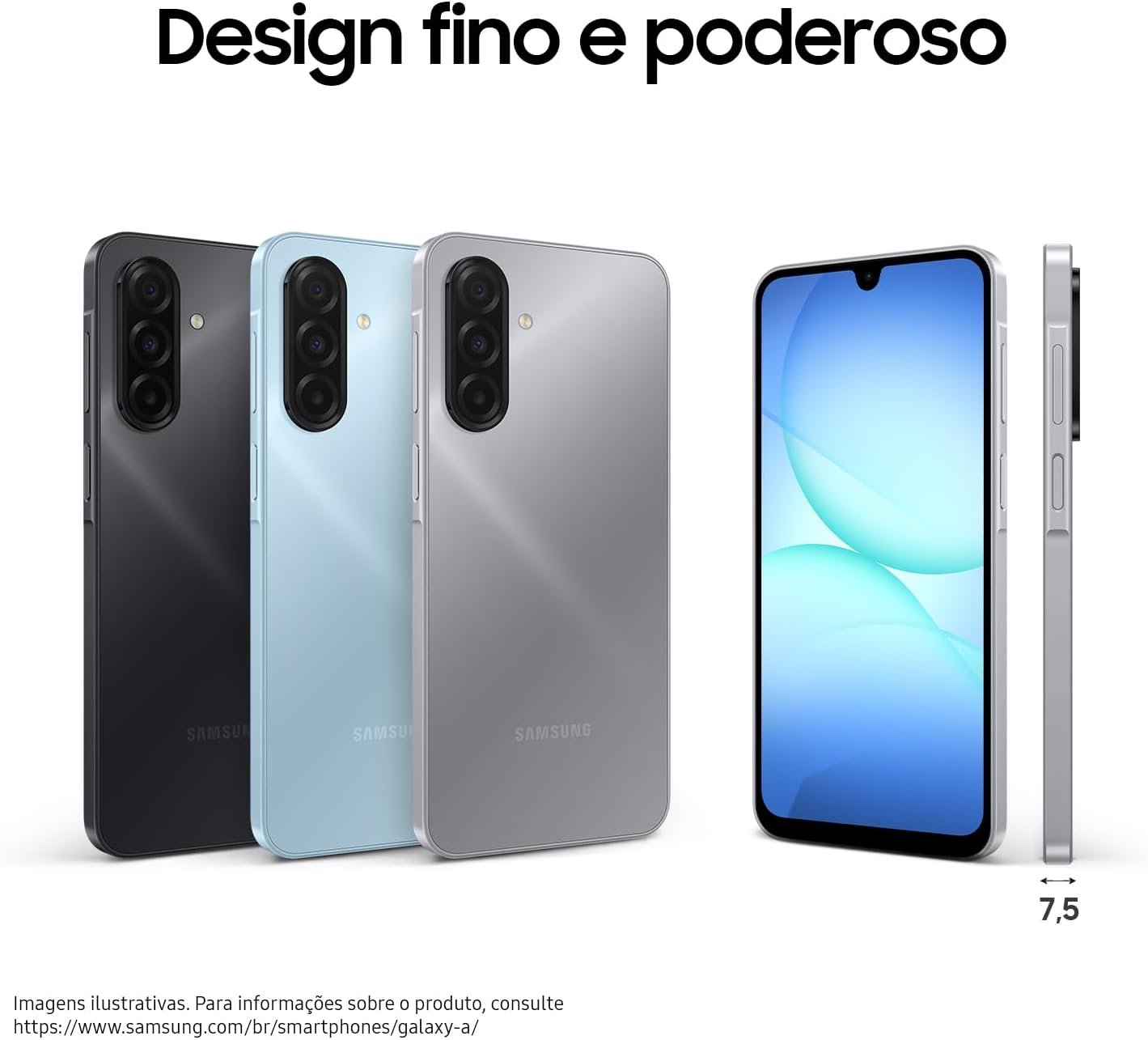 Celular Samsung Galaxy A17 com IA integrada, 128GB, 4GB RAM, 4GB RAM Plus, câmera tripla traseira de até 50MP, câmera frontal de 13MP, tela resistente Super AMOLED de 6,7″, processador Helio G99 Octa-Core de 6nm, Android 15 com 6 atualizações, IP54 de resistência à água e poeira, NFC, Samsung Wallet e bateria de 5.000mAh. Dual chip.