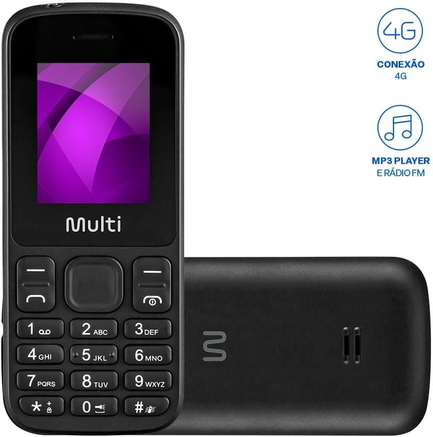 Celular Multi Up 4G com processador eficiente e tecnologia 4G para chamadas de alta qualidade. Tela QVGA LCD de 1.77”. Dual chip para uso de dois números simultâneos. Design compacto e leve. Recursos: visor externo para chamadas, bateria de longa duração, botão SOS para chamadas de emergência, câmera traseira integrada, rádio FM, MP3 player, teclas grandes e lanterna embutida. Permite consultar chamadas, nível de bateria e mensagens sem abrir o aparelho.