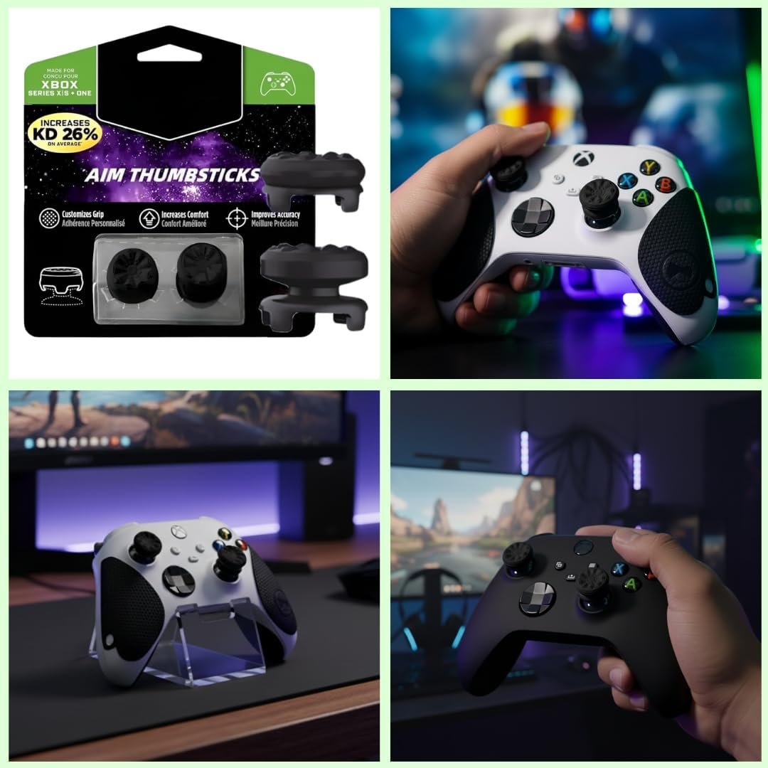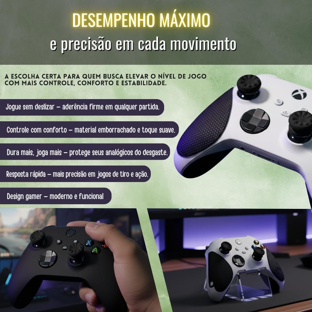 Os grips para Xbox são acessórios de silicone que se encaixam nos analógicos dos controles Xbox One, Series S e Series X. Eles oferecem maior aderência, conforto e proteção contra desgaste, poeira e suor. Com instalação simples, visam melhorar o controle em jogos variados, especialmente em títulos de tiro e esportes competitivos, contribuindo para maior durabilidade dos analógicos durante o uso contínuo.