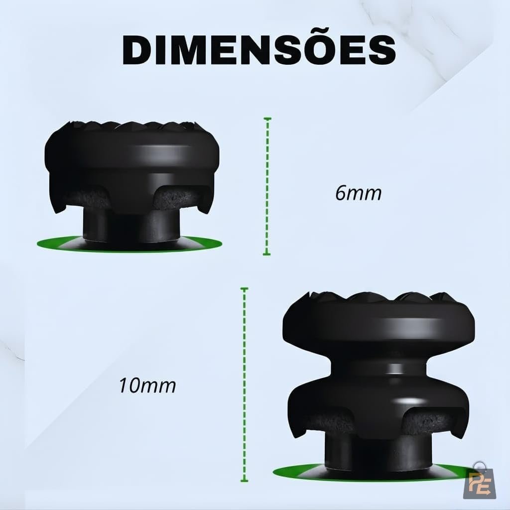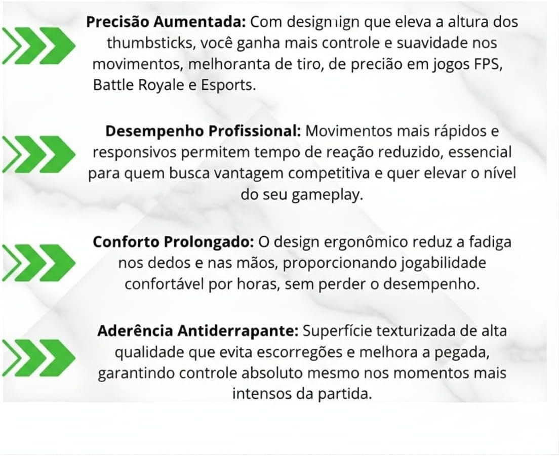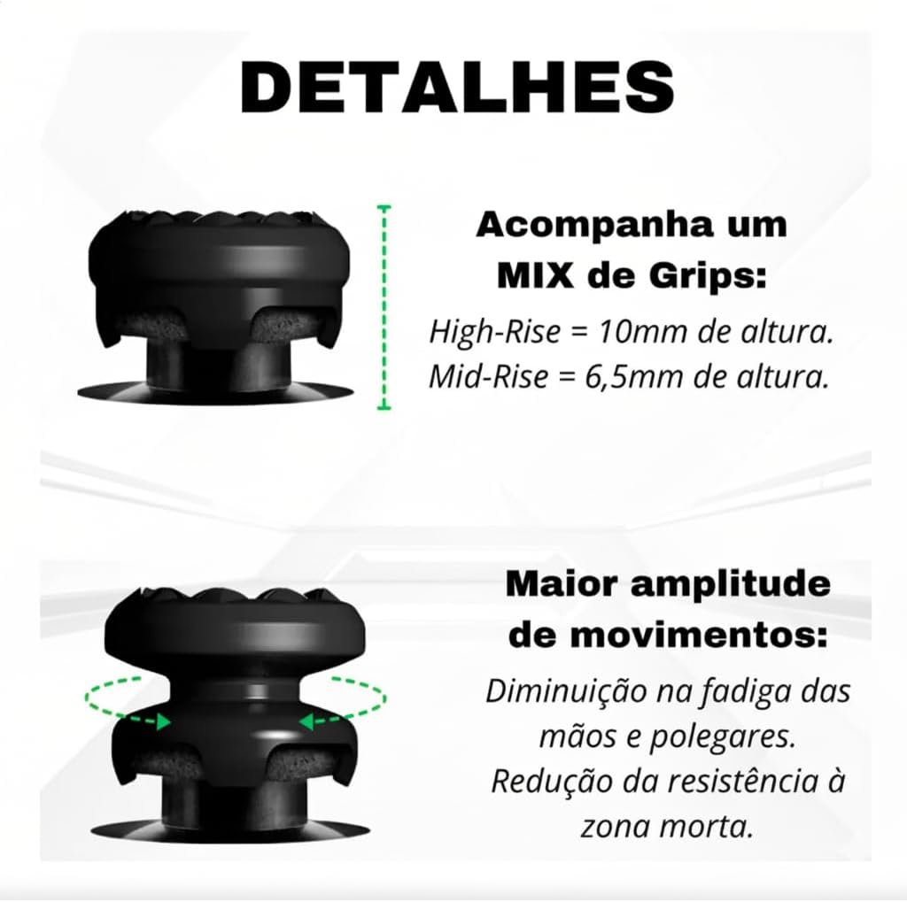 Além de melhorar a performance, protegem os analógicos contra poeira, suor e abrasão, aumentando sua durabilidade. O design com grip elevado em um dos lados aumenta o controle direcional e a mira em jogos de tiro e esportes competitivos. A superfície emborrachada texturizada reduz o cansaço dos dedos e evita escorregões durante longas horas de jogo. Produzidos em borracha premium e material ABS resistente, garantem firmeza e uso prolongado.