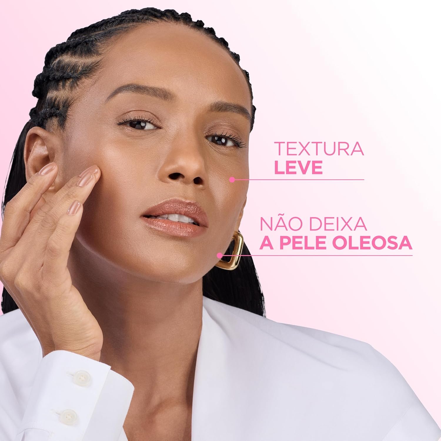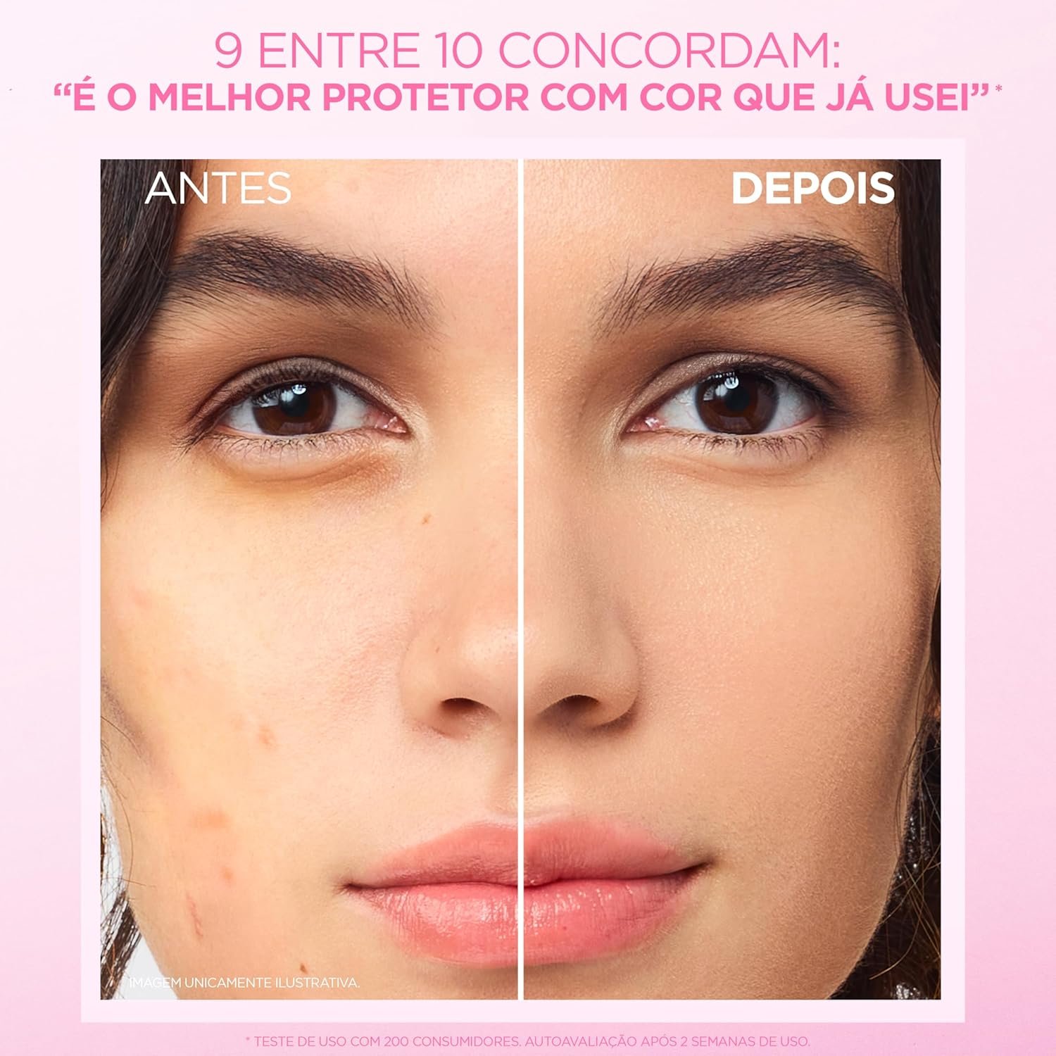 Protege contra os principais tipos de radiação solar, prevenindo queimaduras e danos cumulativos à pele. Produto com dimensões de 2,75 x 3,35 x 13,5 cm e 80 g, fabricado pela L’Oréal Brasil, com avaliação média de 4,7 estrelas por 431 clientes. Testes indicam que 9 em cada 10 consumidores consideram o produto melhor que sua base atual.