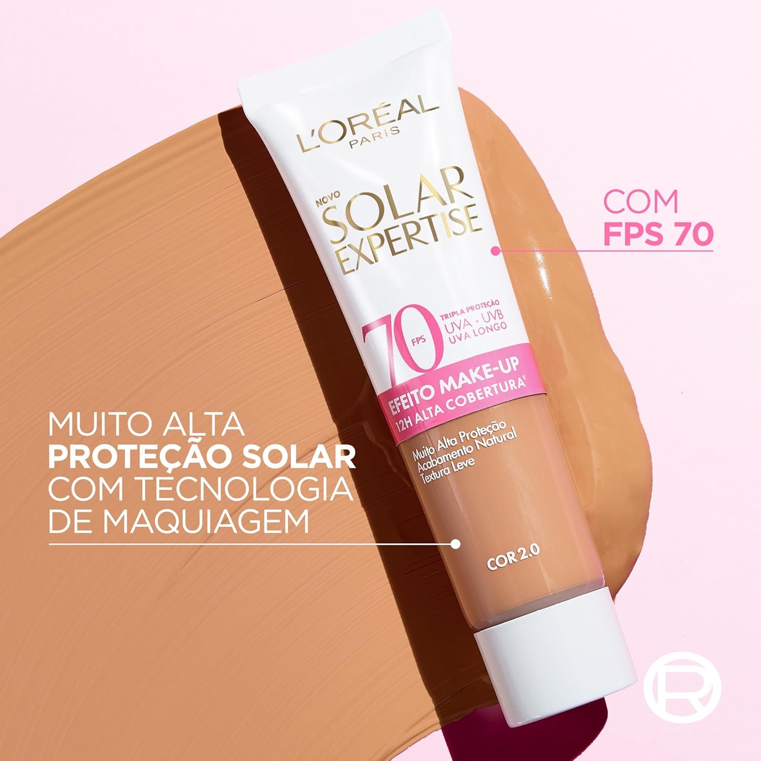 L’Oréal Paris Solar Expertise Efeito Make-Up, Protetor Solar com Cor FPS 70, Cobertura de Maquiagem por até 12h, Tripla Proteção Solar contra raios UVB, UVA, UVA Longo e Luz Visível Cor 2.0, 30g