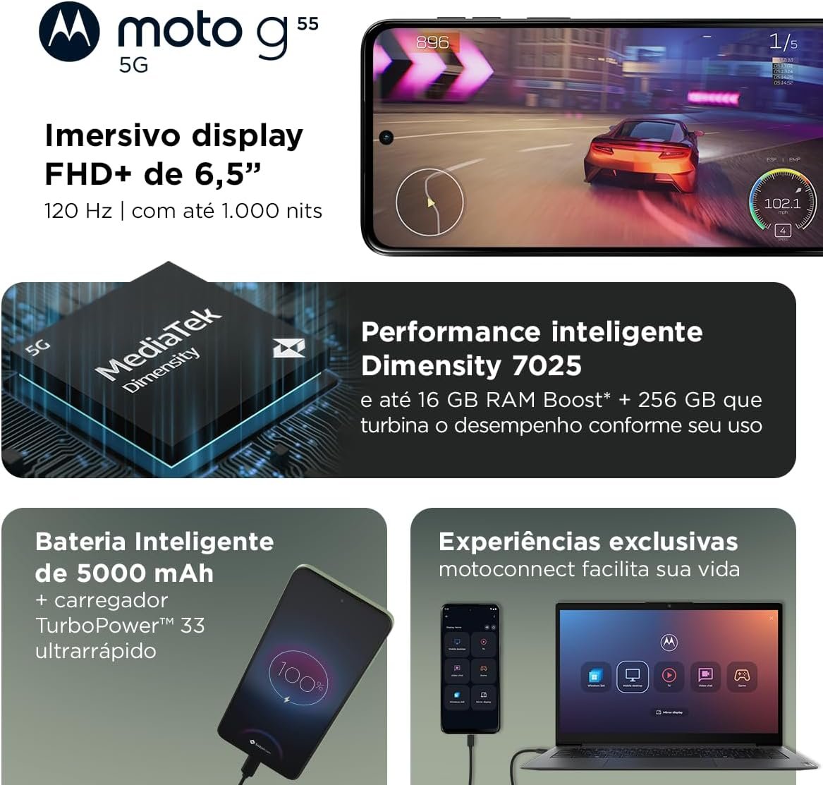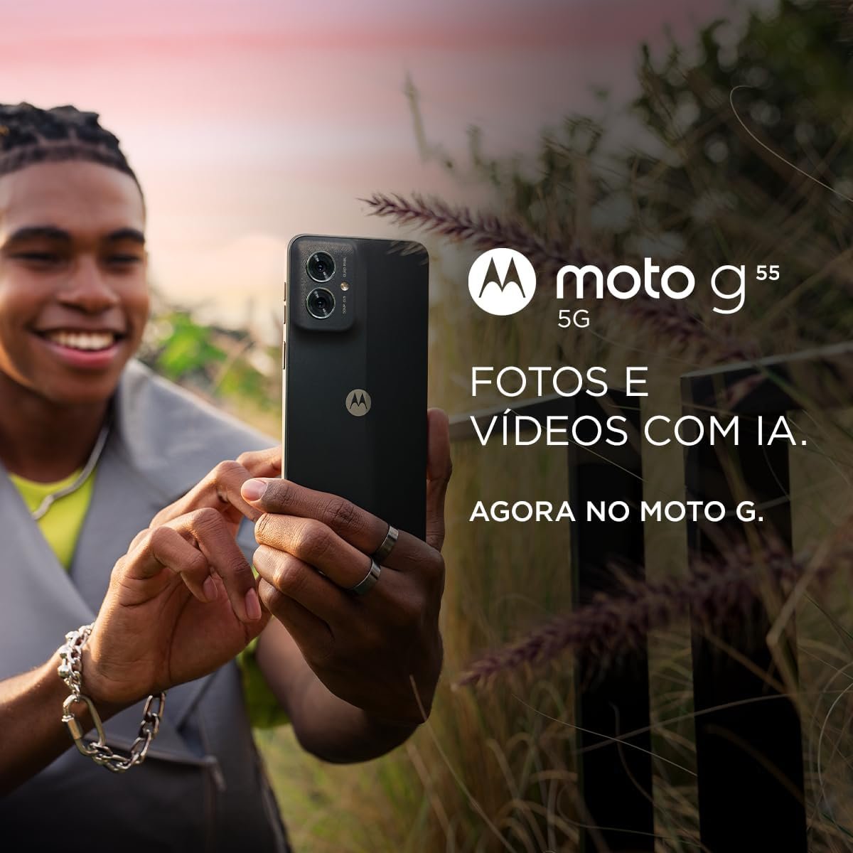 Conheça o Moto G55, com até 16GB de RAM Boost e 256GB de armazenamento. Fotos e vídeos com AI agora no Moto G, proporcionando uma experiência imersiva com imagem de ultra brilho, tela super resistente e sensor de câmera minimalista.