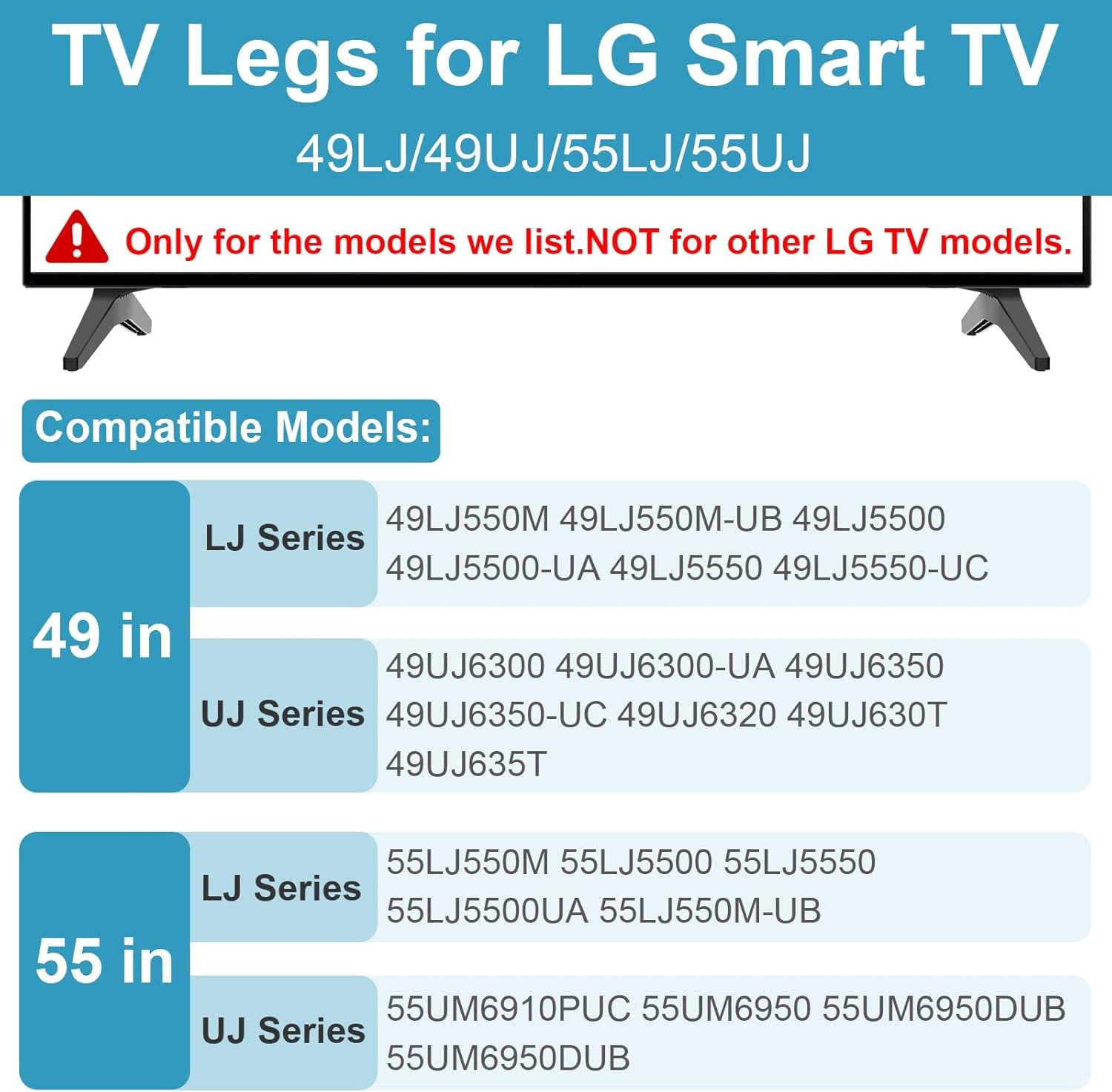 Ampla compatibilidade: suporte de TV para substituição de pernas de TV LG, compatível com modelos 49LJ/UJ e 55LJ/UJ, incluindo 49LJ550M, 49LJ550M-UB, 49LJ5500, 49LJ5500-UA, 49LJ5550, 49LJ5550-UC, 49UJ6300, 49UJ6300-UA, 49UJ6350, 49UJ6350-UC, 49UJ6320, 49UJ630T, 49UJ635T, 55LJ550M, 55LJ5500, 55LJ5550, 55LJ5500UA, 55LJ550M-UB, 55UJ6300, 55UJ6300UA, 55UJ6320, 55UJ630T e 55UJ635T. Números de peça: AAN75851222, AAN75851221, AAN75851224, AAN75851223, MAM643660, MEZ64114730, AAN75851265 e AAN75851266. Observação: não compatível com outros modelos LG.