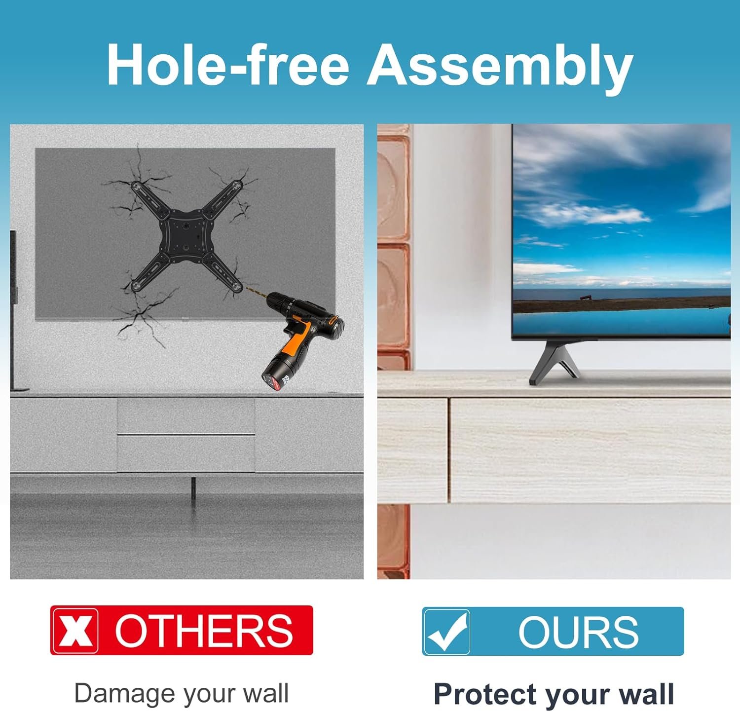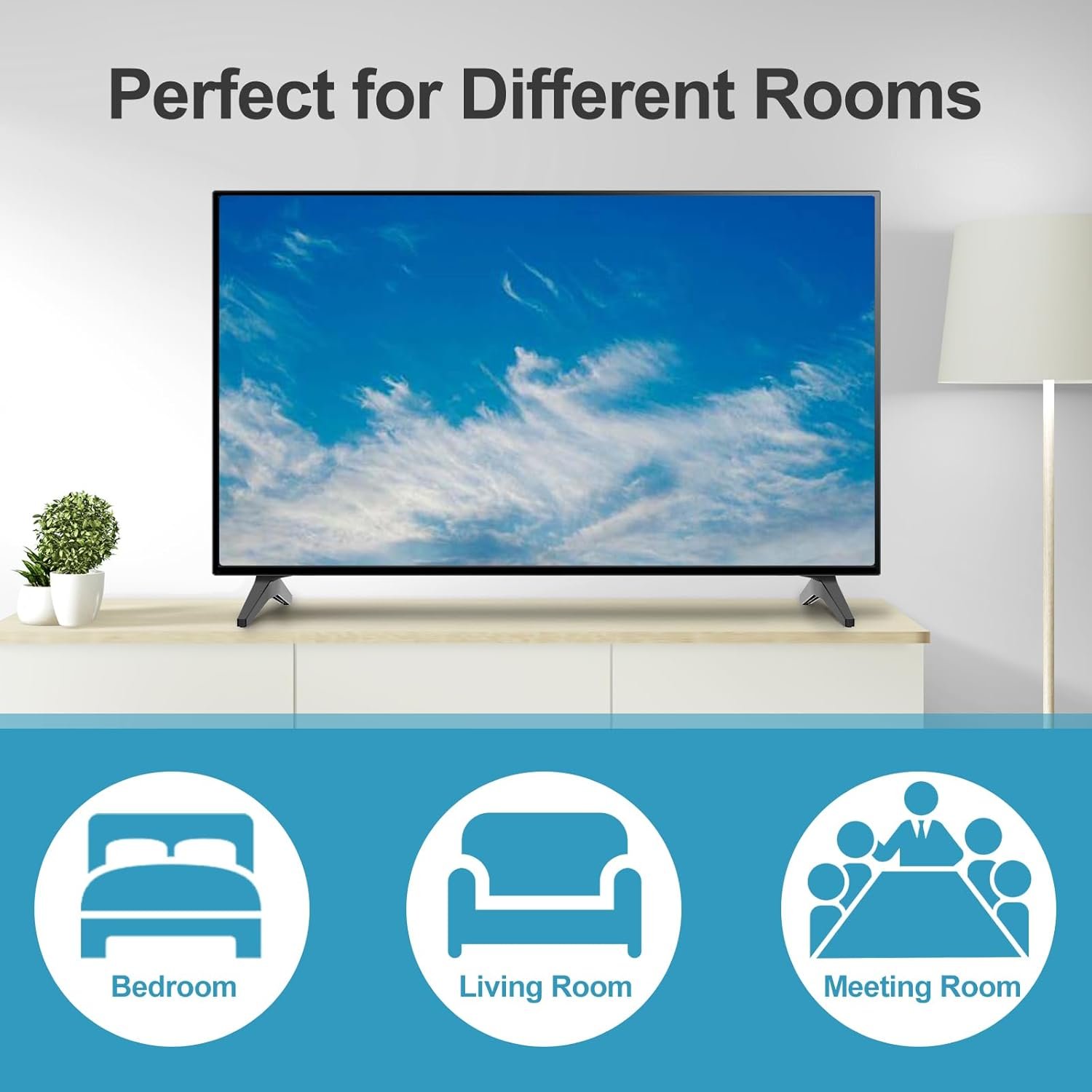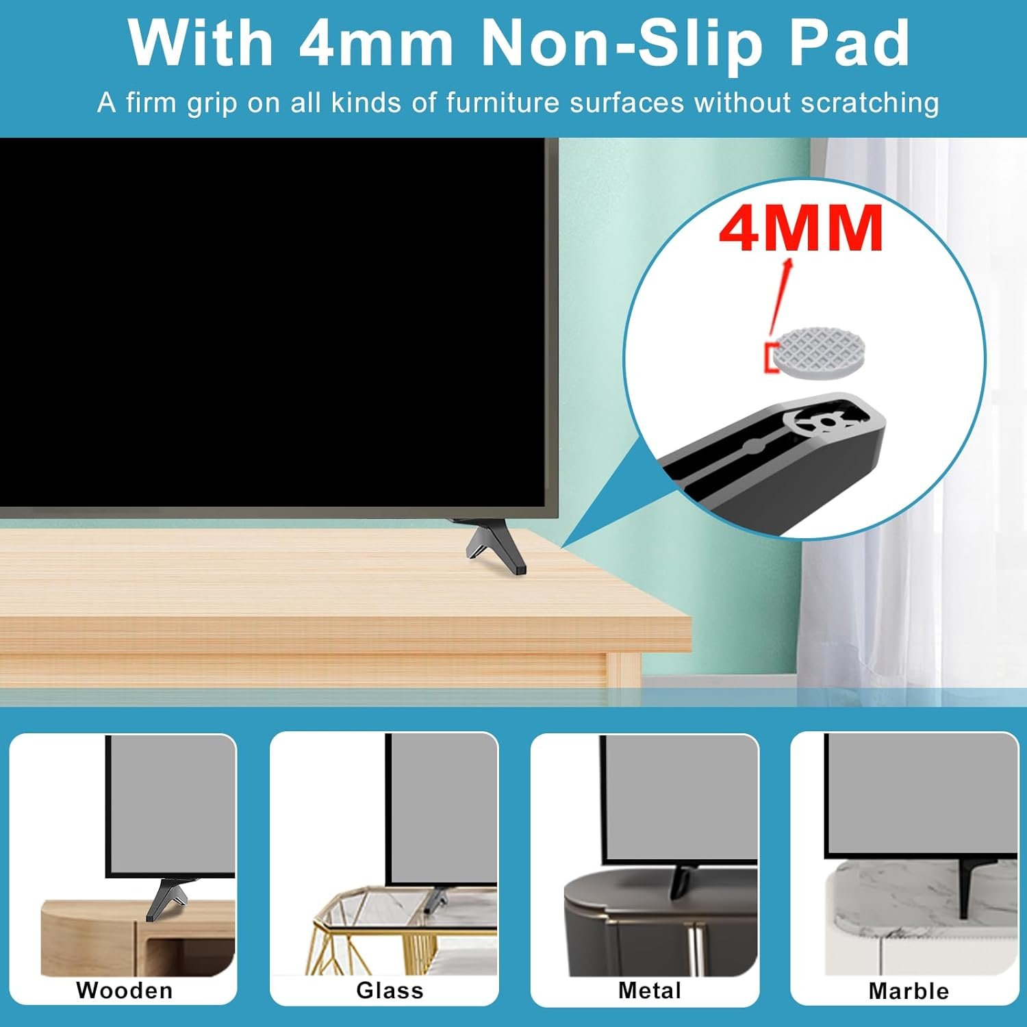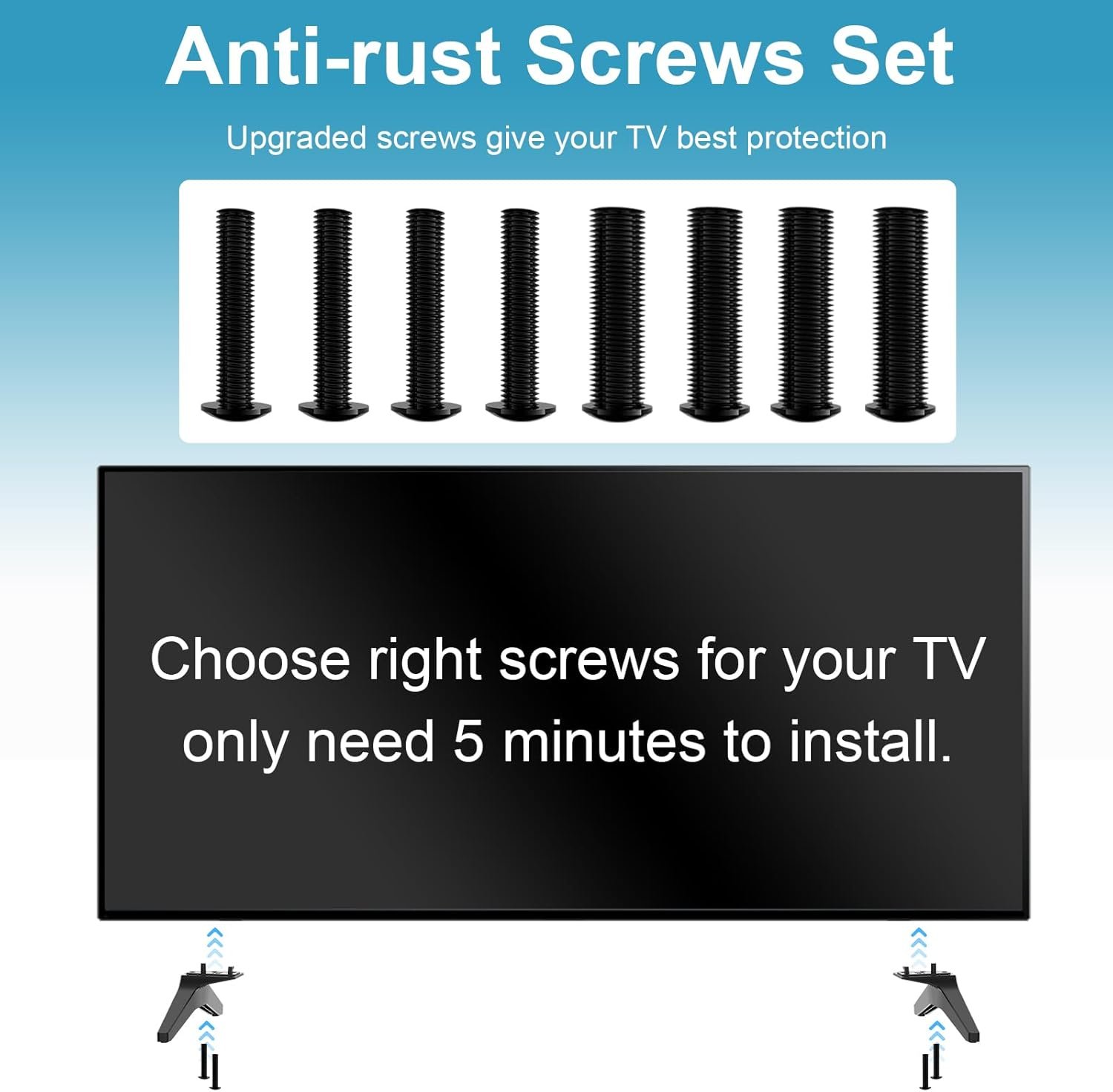 O pacote inclui parafusos e instruções para instalação rápida, sem necessidade de perfuração, protegendo a parede. As pernas possuem almofada antiderrapante de 4 mm que evita arranhões e mantém a TV estável. Fabricado em ABS de alta qualidade, suporta até 36 kg. A montagem pode ser concluída em 5 minutos. A instalação eleva a TV à altura dos olhos, otimizando o ângulo de visão e reduzindo tensão no pescoço e nos olhos, proporcionando maior conforto.