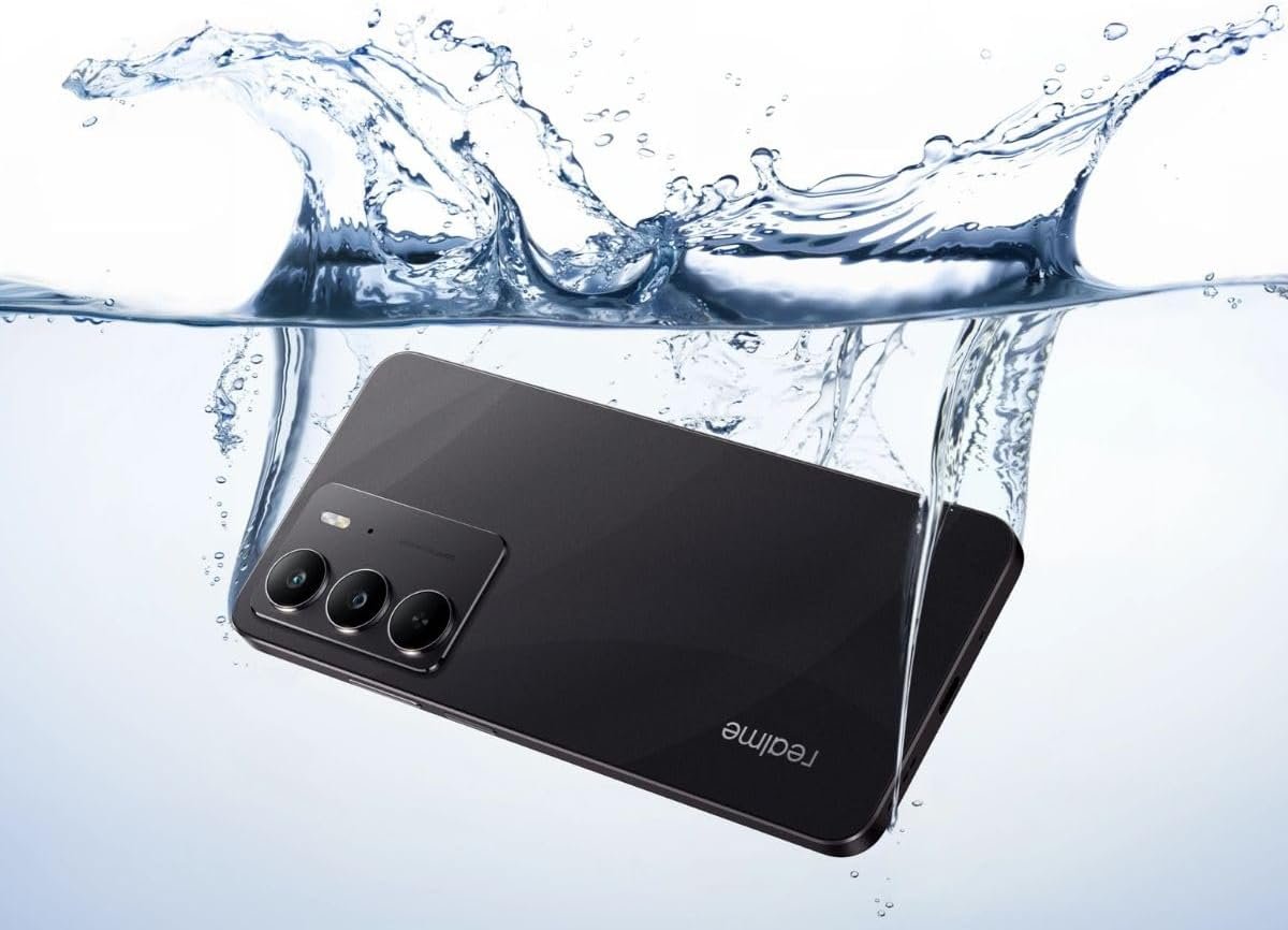 O dispositivo conta com o processador MediaTek Helio G92 Max, conectividade 4G, Wi-Fi 5 Dual-Band e Bluetooth 5.0, além de som mono. Possui certificações IP69 e MIL-STD-810H, bateria de 6.000 mAh com carregamento rápido de 45W, e roda Android 14 com Realme UI 5.0. A embalagem inclui smartphone, carregador, cabo USB, capa protetora, agulha para SIM e guia rápido. Cor: Storm Black.