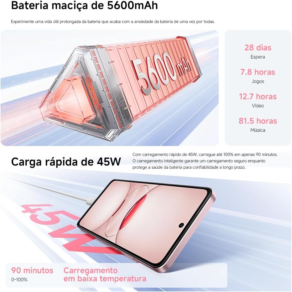 Além disso, o aparelho conta com carregamento rápido de 45W via porta Type-C e está disponível nas cores rosa e preto. A proteção de armadura reforça a durabilidade do dispositivo, ideal para uso diário.