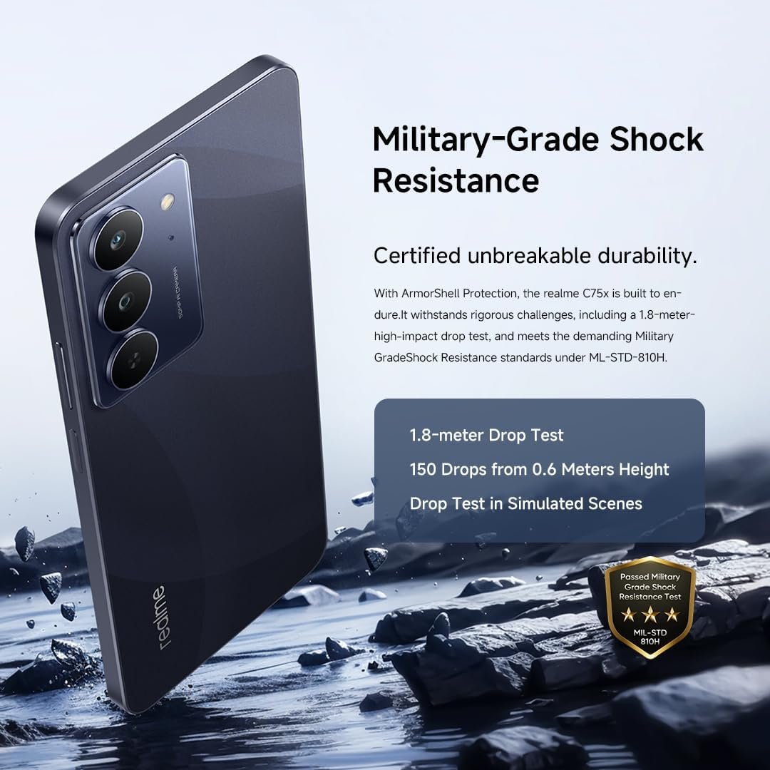 Realme C75X Celular 8GB RAM 256GB ROM. Possui resistência à poeira e água com certificação IP69. Conta com carregamento rápido de 45 W e tela de 6,67″.