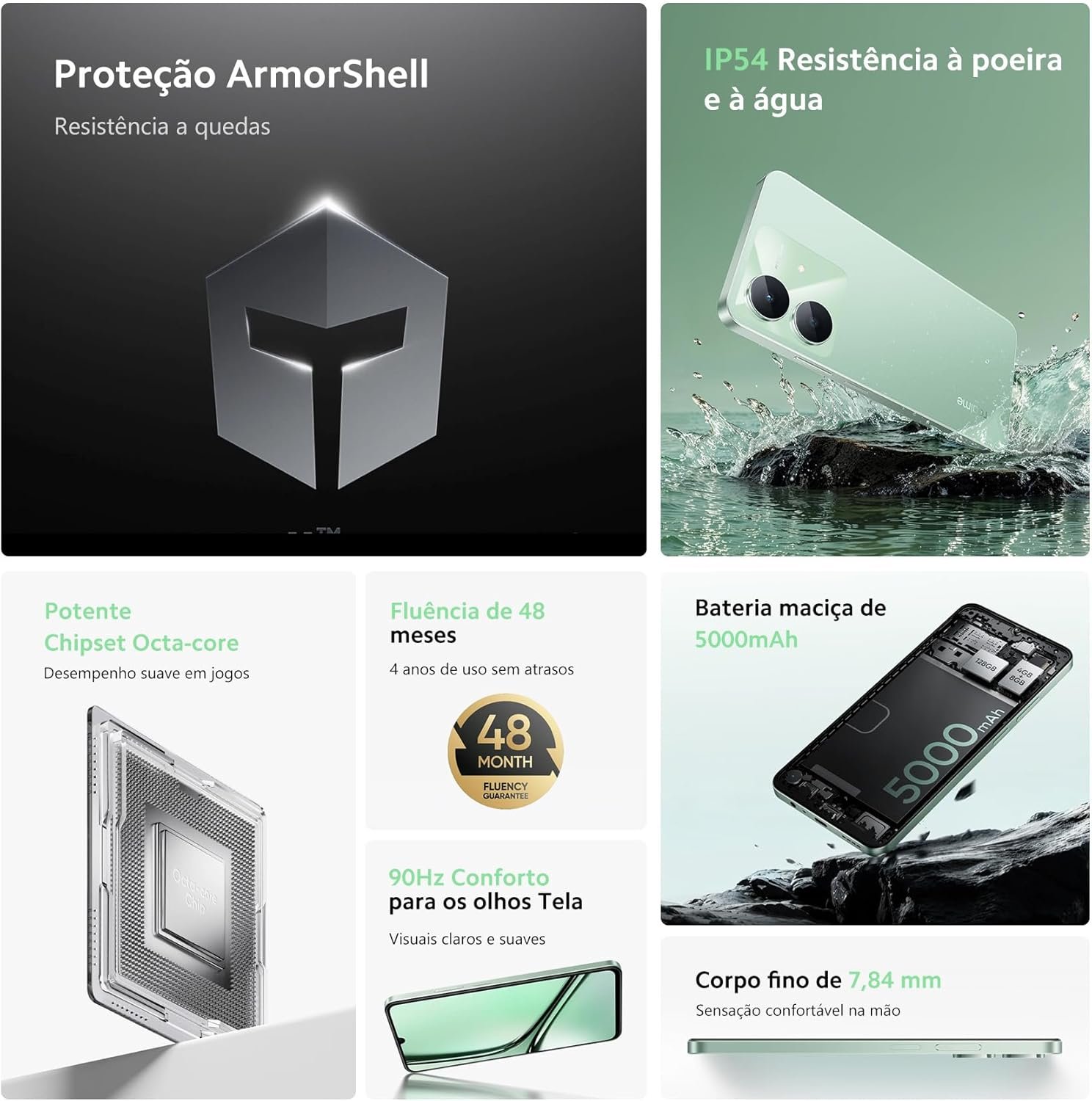 Memória interna de 64 GB, RAM de 3 GB com expansibilidade dinâmica de 8 GB, suporte a cartão Micro-SD de até 2 TB. Processador Unisoc T612 (12 nm), CPU Octa-Core (2x Cortex-A75 até 1,8 GHz e 6x Cortex-A55 até 1,8 GHz) e GPU ARM Mali-G57. Câmeras traseiras: 8 MP (principal) e 2 câmeras; frontal: 5 MP. Vídeo Full HD traseiro e 1280×720 frontal. Classificação IP54, resistente à água e pó, com acelerômetro, proximidade, giroscópio e bússola. Itens inclusos: celular, carregador USB-A, cabo USB-C, manual e extrator do cartão SD.