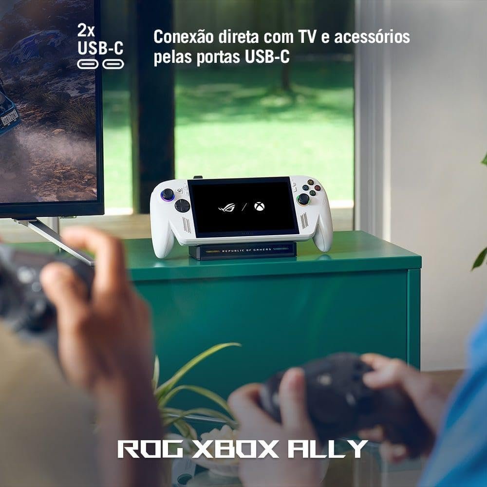 O produto é indicado para jogos em formato portátil, oferecendo suporte a títulos do Xbox e de plataformas PC. Permite uso em diferentes locais devido à bateria de alta capacidade e design ergonômico. Possui conectividade USB-C para ligação a TVs, carregadores e periféricos. Compatível com Windows 11 Home, oferece tela de alta resolução com 120Hz e FreeSync Premium para jogabilidade fluida, além de controle personalizado e armazenamento interno para múltiplos jogos.