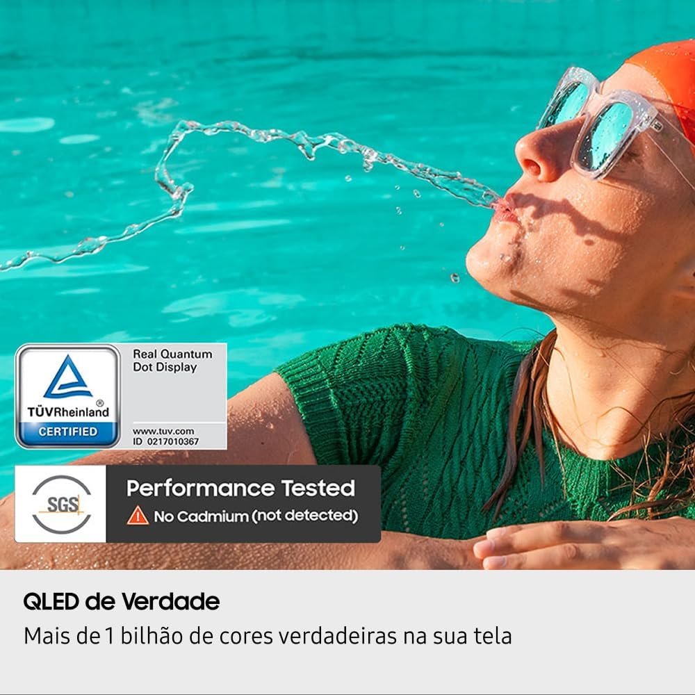 A tecnologia de pontos quânticos garante cores vibrantes e reais, ressaltadas por uma camada de cristais, na primeira linha de TVs certificada pela PANTONE. O produto não contém cádmio, metal pesado prejudicial à saúde e ao meio ambiente. A TV Tudo em 1 da Samsung oferece TV, videogame, karaokê e mais de 400 canais gratuitos no Samsung TV Plus e apps parceiros. Com o modo Karaokê, conecte seu microfone e acesse mais de 100 mil músicas. Pelo Samsung Gaming Hub, jogue mais de 3.000 títulos com Xbox Game Pass e Nvidia GeForce Now, sem downloads ou consoles.