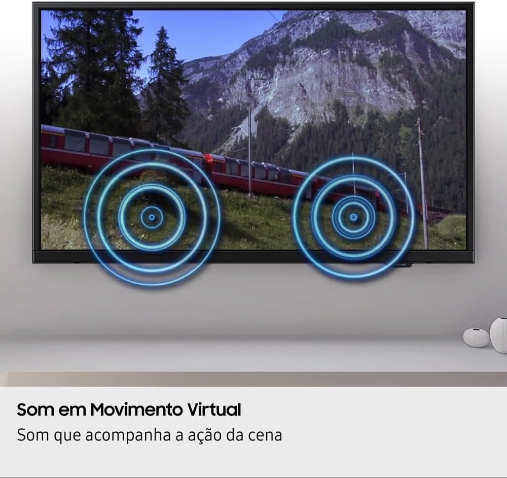 O HDR amplia brilho, contraste e detalhes, enquanto a resolução Full HD e a tecnologia PurColor proporcionam imagens realistas e imersivas. O Realce de Contraste ajusta automaticamente o contraste da tela. A Central de Segurança Knox protege seus dispositivos e senhas, com login via QR Code. O controle remoto pelo celular é possível pelo SmartThings. O AI Energy Mode ajusta o brilho para economizar energia. O som em movimento virtual, som adaptativo e Q-Symphony garantem áudio imersivo. O design Slim Look combina com qualquer ambiente.
