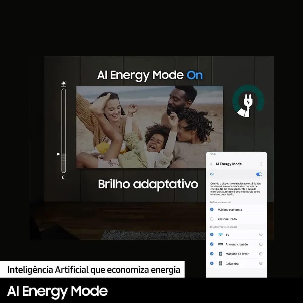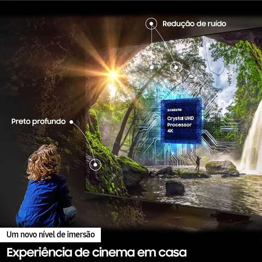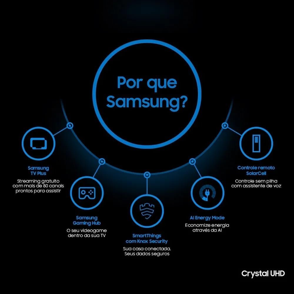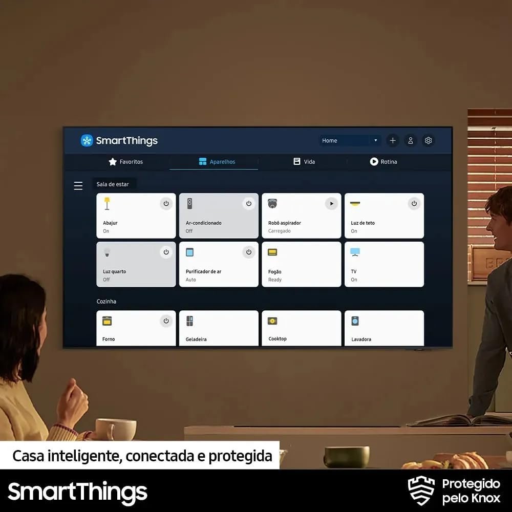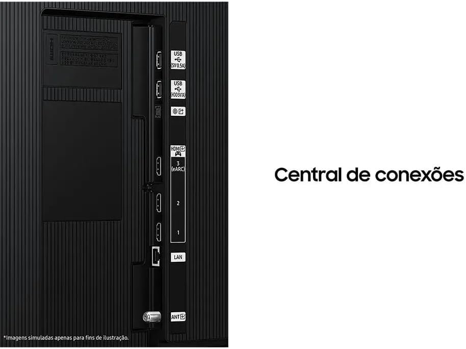 O som adaptativo calibra automaticamente o áudio conforme as cenas exibidas. O Smart Hub Tizen reúne filmes, séries e jogos, sugerindo conteúdos conforme o uso. O controle por voz em português inclui Bixby e Alexa integrados. A TV também possui SmartThings Built in Hub com Knox Security para uma casa inteligente, conectada e segura.