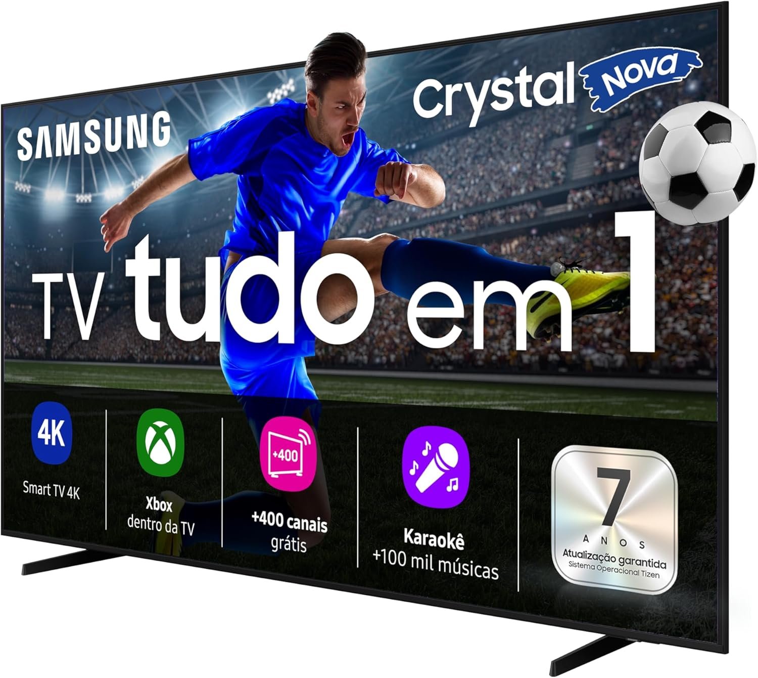 Xbox Cloud Gaming, canais gratuitos, 7 anos de atualização, controle sem pilhas e Alexa. O processador Crystal 4K exclusivo da TV Samsung otimiza o conteúdo para até 4K, conforme a cena, proporcionando imagens realistas com resolução quatro vezes maior que TVs FHD. A tecnologia HDR realça o contraste, aumentando brilho, detalhes e profundidade em cenas claras e escuras.