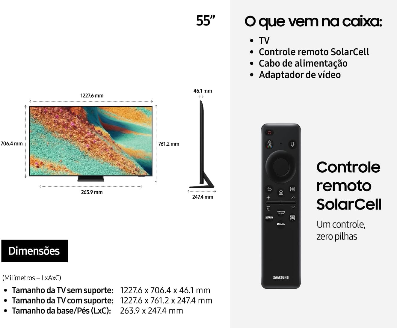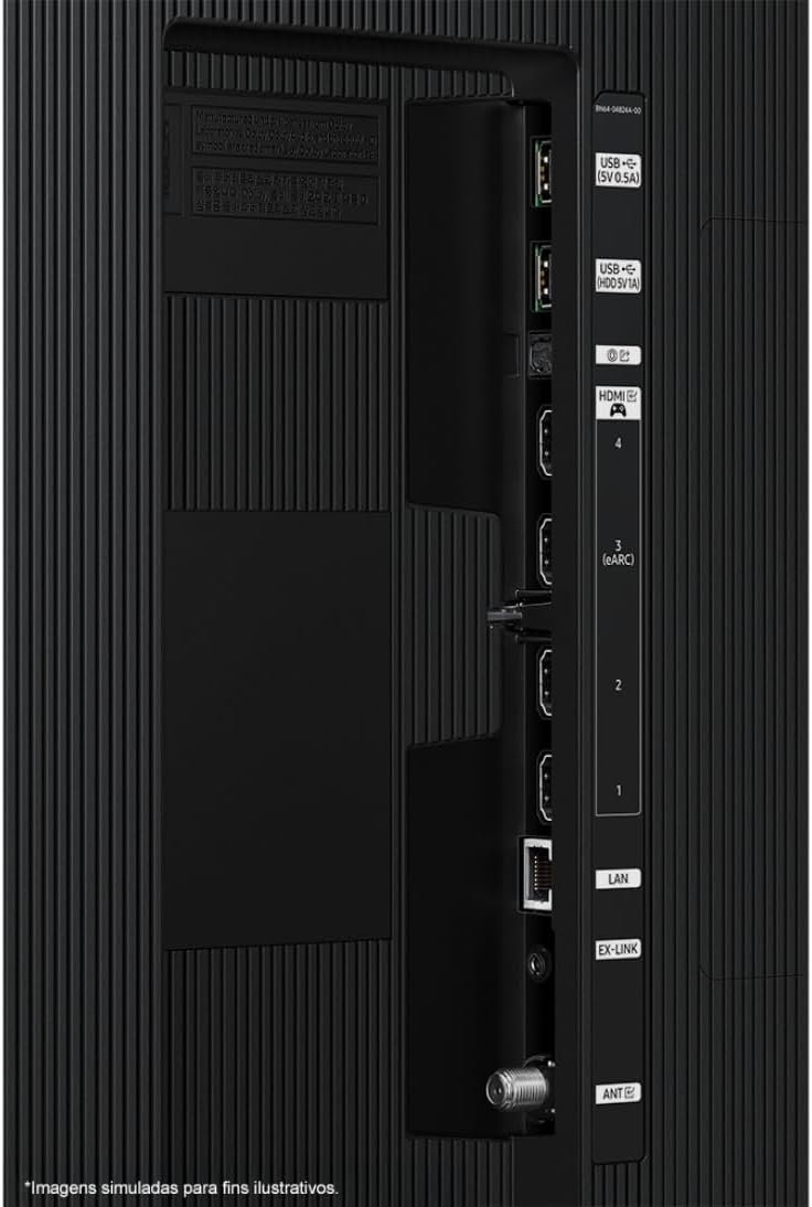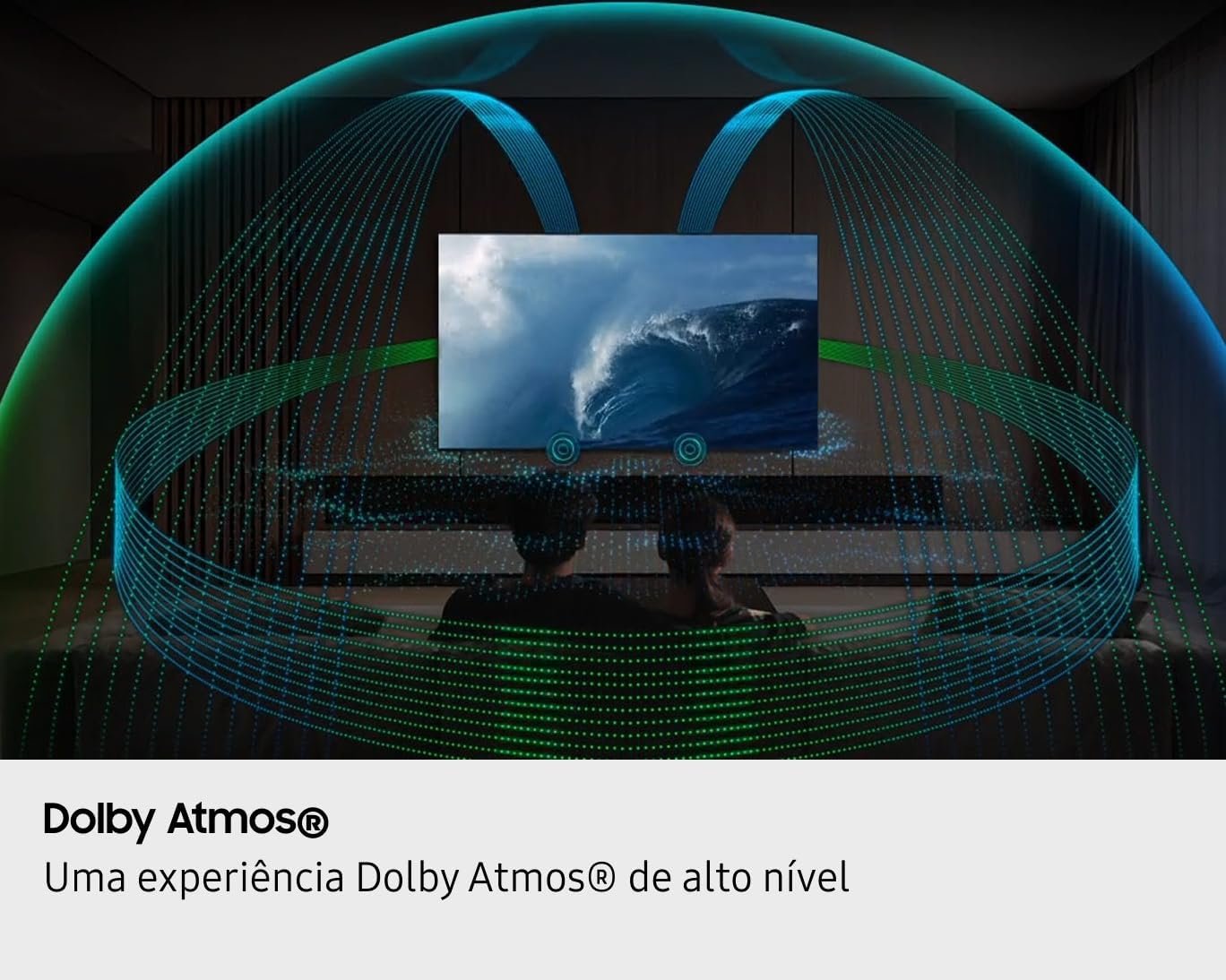 Controle a TV por gestos com o Galaxy Watch ou pelo aplicativo SmartThings. O Modo AI personaliza som e imagem conforme suas preferências, além de converter SDR para HDR 4K. A AI gera papel de parede personalizado e oferece modo karaokê com mais de cem mil músicas. O processador NQ4 AI Gen 2 melhora brilho, cor e textura, enquanto o Modo Game ajusta configurações automaticamente. Atualizações garantidas por 7 anos. Acesse Xbox Cloud Gaming, Nvidia GeForce Now e canais gratuitos via Samsung TV Plus e Gaming Hub.