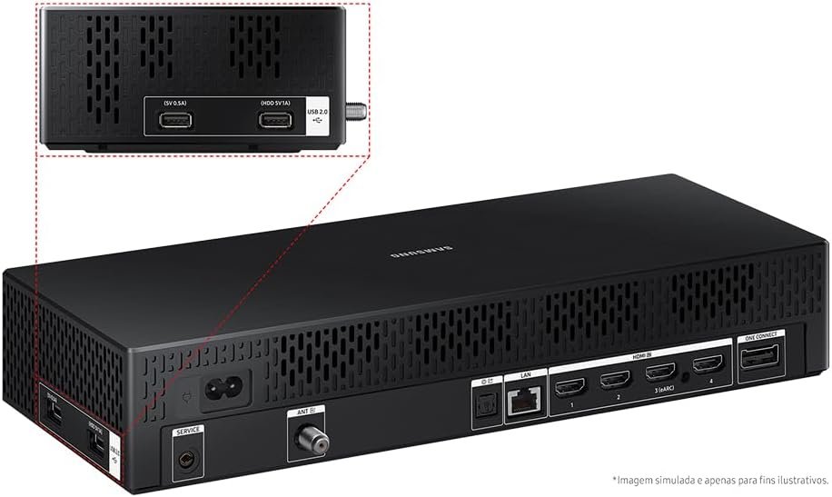 A The Frame se transforma em obra de arte quando desligada, com design fino de menos de 3 cm, semelhante a um quadro. O suporte Slim Fit Wall Mount mantém a TV rente à parede, conectada por um único cabo ao One Connect. O modo Karaokê oferece mais de cem mil músicas, usando o celular como microfone. Fotos pessoais podem ser exibidas via SmartThings ou USB, e o sensor de iluminação ajusta a imagem conforme o ambiente.