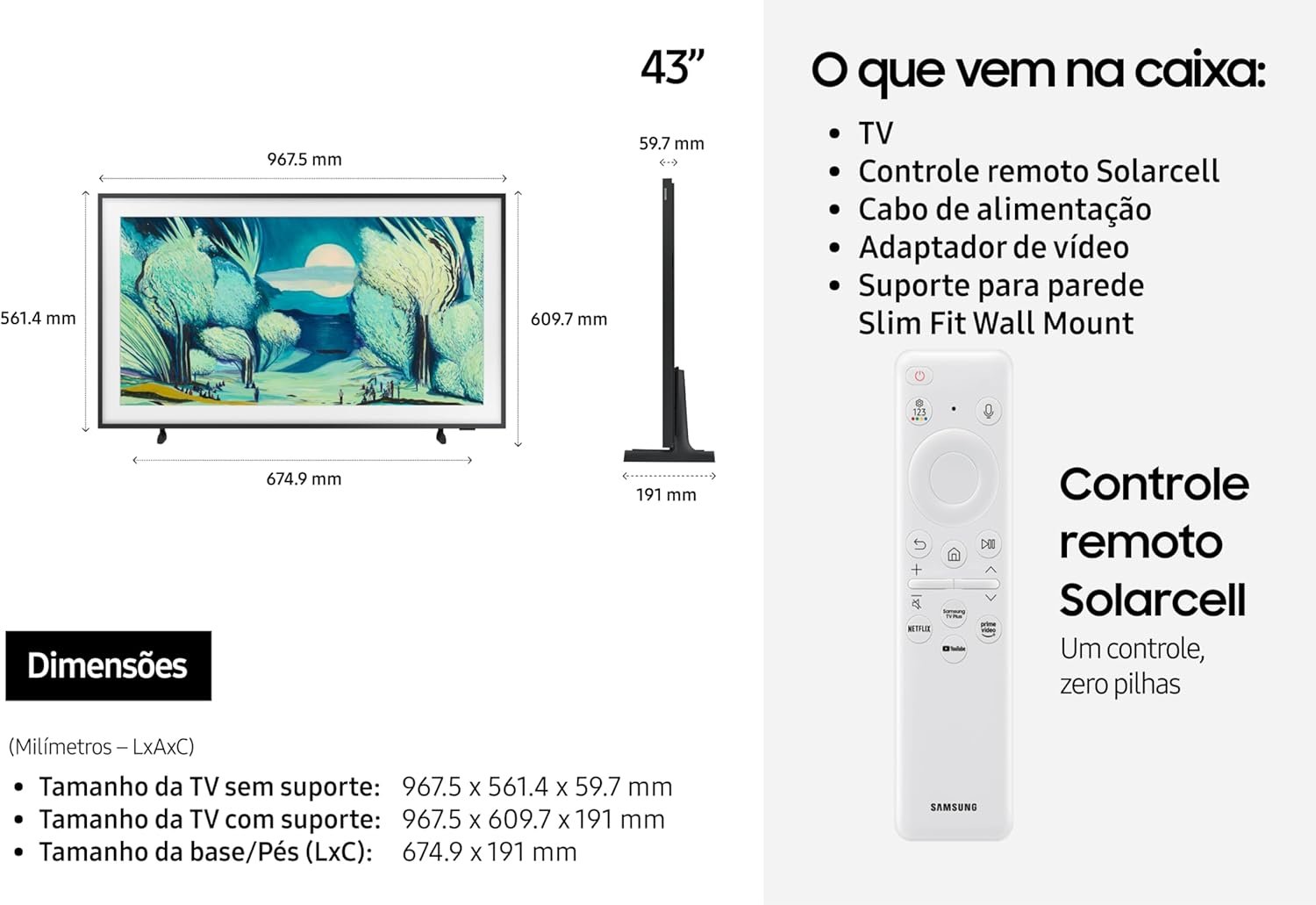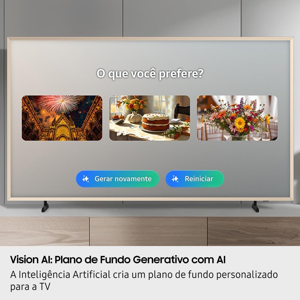 Samsung Vision AI TV 43″ The Frame 4K LS03F 2025, com tela Matte antirreflexo, molduras customizáveis, modo Arte, suporte de parede incluso, One Connect, Dolby Atmos® e 7 anos de atualização. A tela Matte elimina reflexos, proporcionando clareza e detalhes nas texturas. As molduras magnéticas adaptam a TV ao ambiente, com instalação simples e rápida. A inteligência artificial gera papéis de parede personalizados e permite controle por gestos via Galaxy Watch ou aplicativo SmartThings.