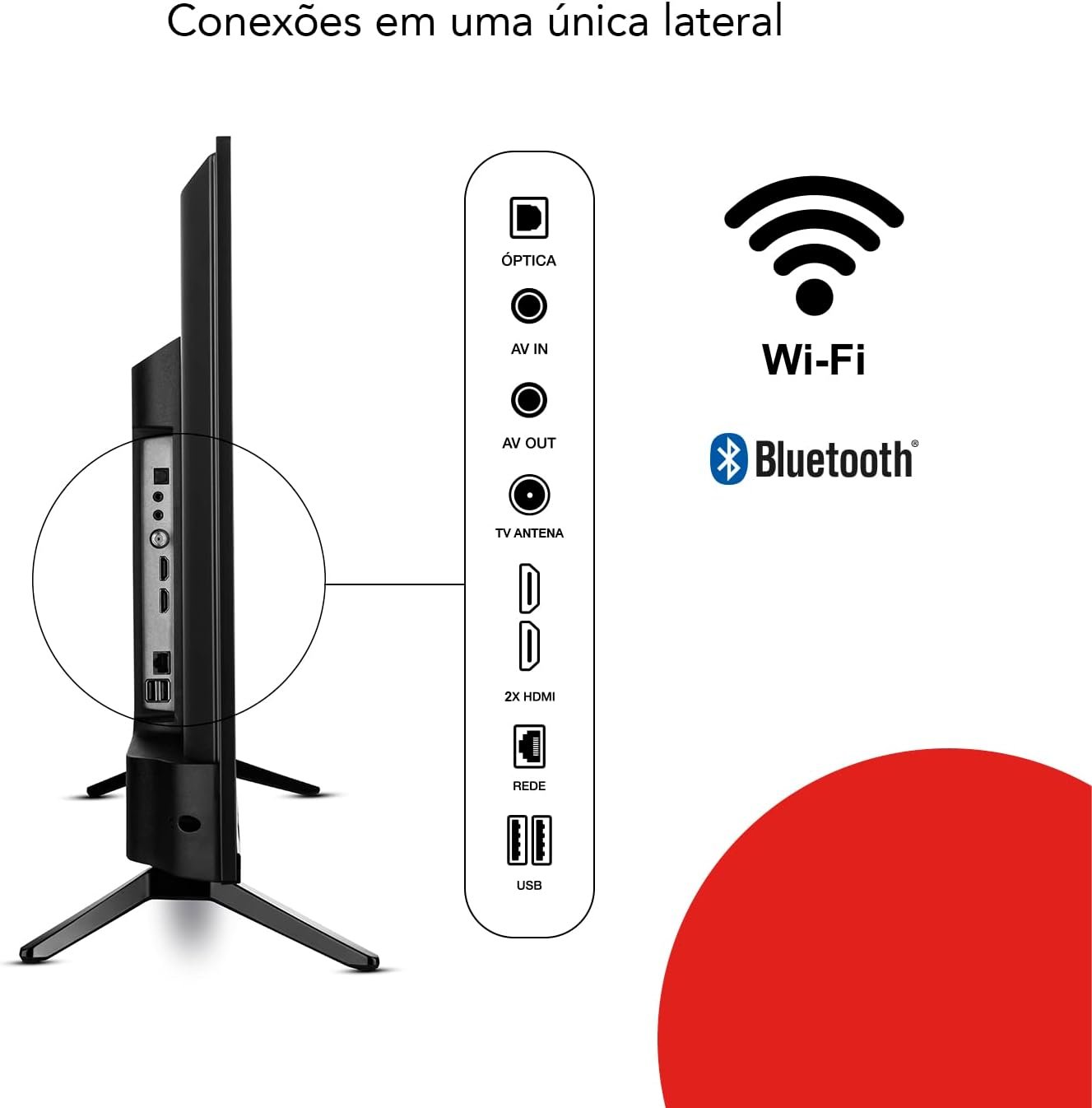 A TV conta ainda com BLUE PROTECT, que reduz em até 90% a emissão de luz azul, protegendo a visão. O processador Quad Core garante velocidade e qualidade de imagem. Possui Bluetooth para pareamento com dispositivos de som e conexões laterais com 2 HDMI, 2 USB e Wi-Fi. A garantia é de um ano.
