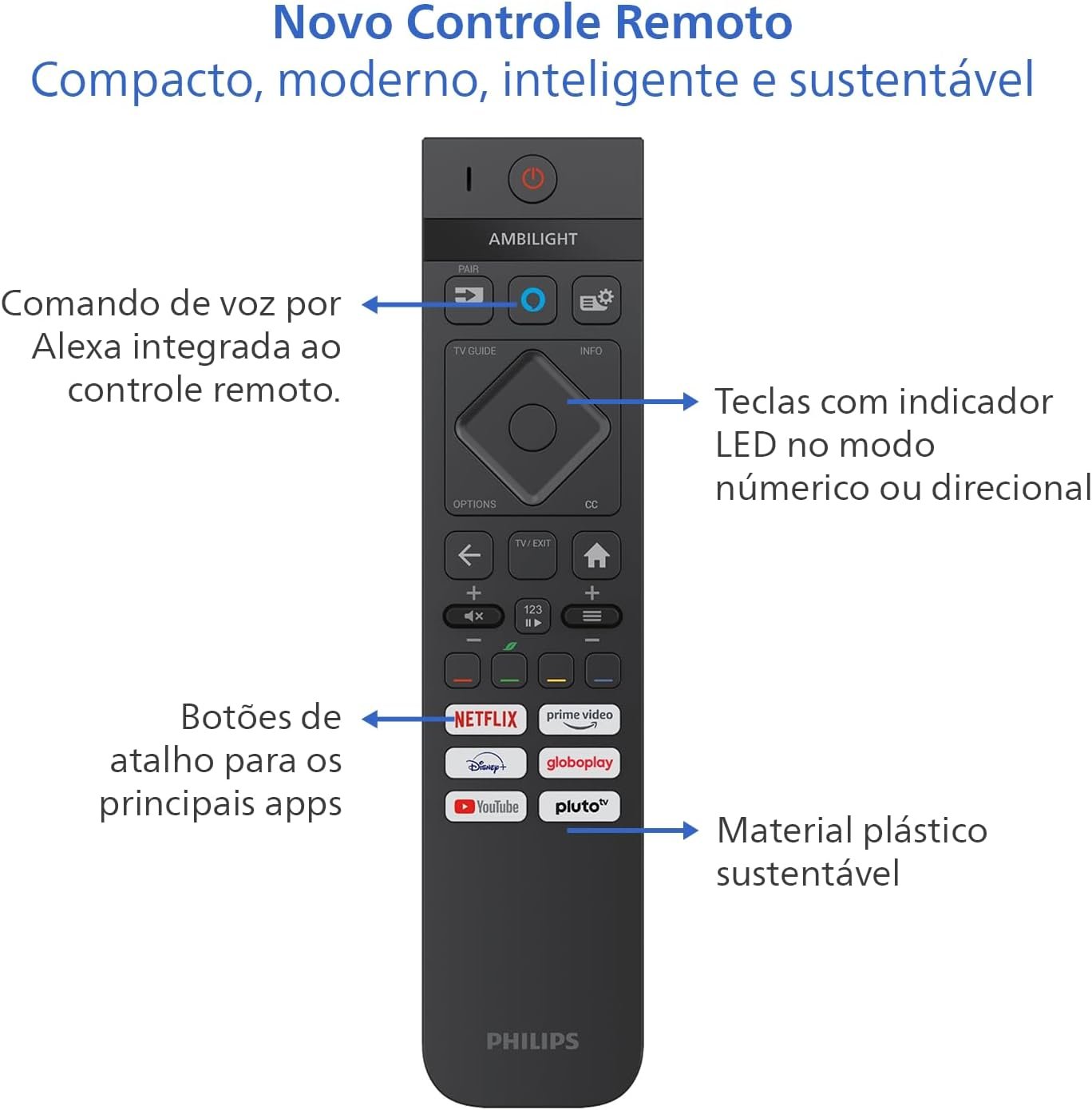 O que inclui: 1 Smart TV Philips 55″, 1 controle remoto, 2 pilhas AAA, cabo de energia, guia de início rápido, folheto legal e de segurança, suporte para mesa e 1 ano de garantia. A TV oferece luzes Ambilight de três lados, qualidade 4K com processador P5, desempenho para jogos com alta taxa de atualização e design em metal.