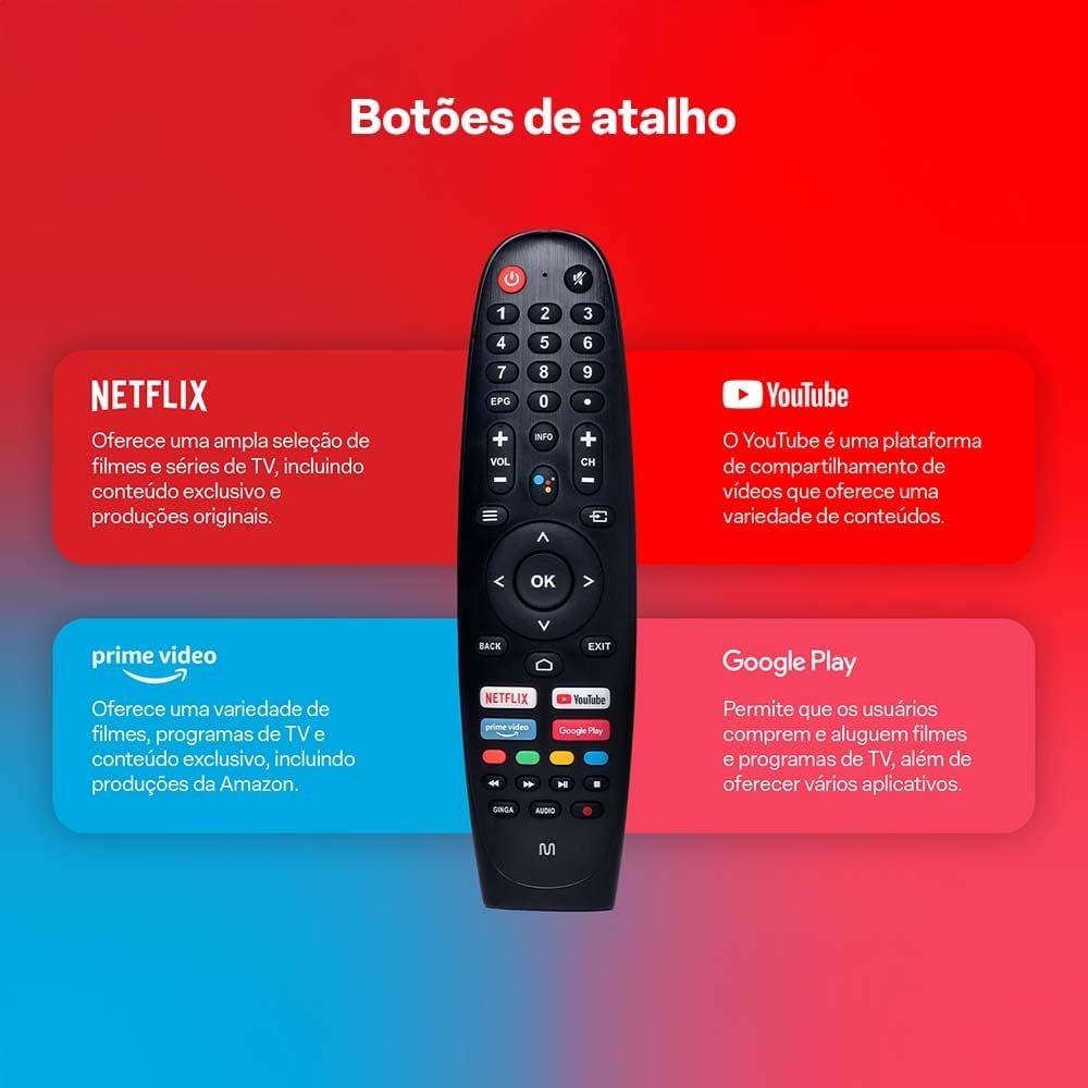 Conta com Chromecast Built-In para transmitir conteúdos do smartphone, tablet ou computador diretamente para a TV, além de espelhamento de smartphone em tempo real. O controle remoto possui botões de acesso rápido para aplicativos de streaming. Outras conexões incluem 3x HDMI, 2x USB e 1x AV. Imagens meramente ilustrativas.