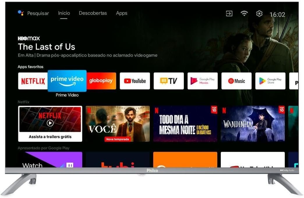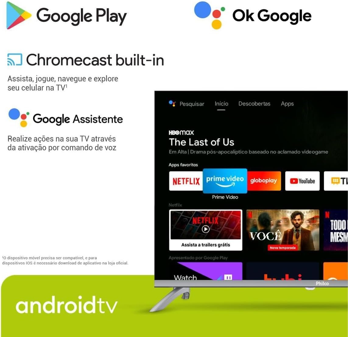 Com o sistema Android TV, você tem acesso a aplicativos como Globo Play e YouTube, garantindo séries, novelas e vídeos para todos os gostos. O processador Quad Core assegura navegação ágil e fluida, e as conexões HDMI entregam alta qualidade para filmes e jogos. O som Dolby Audio completa a experiência com áudio cristalino, criando a atmosfera perfeita para momentos em família.