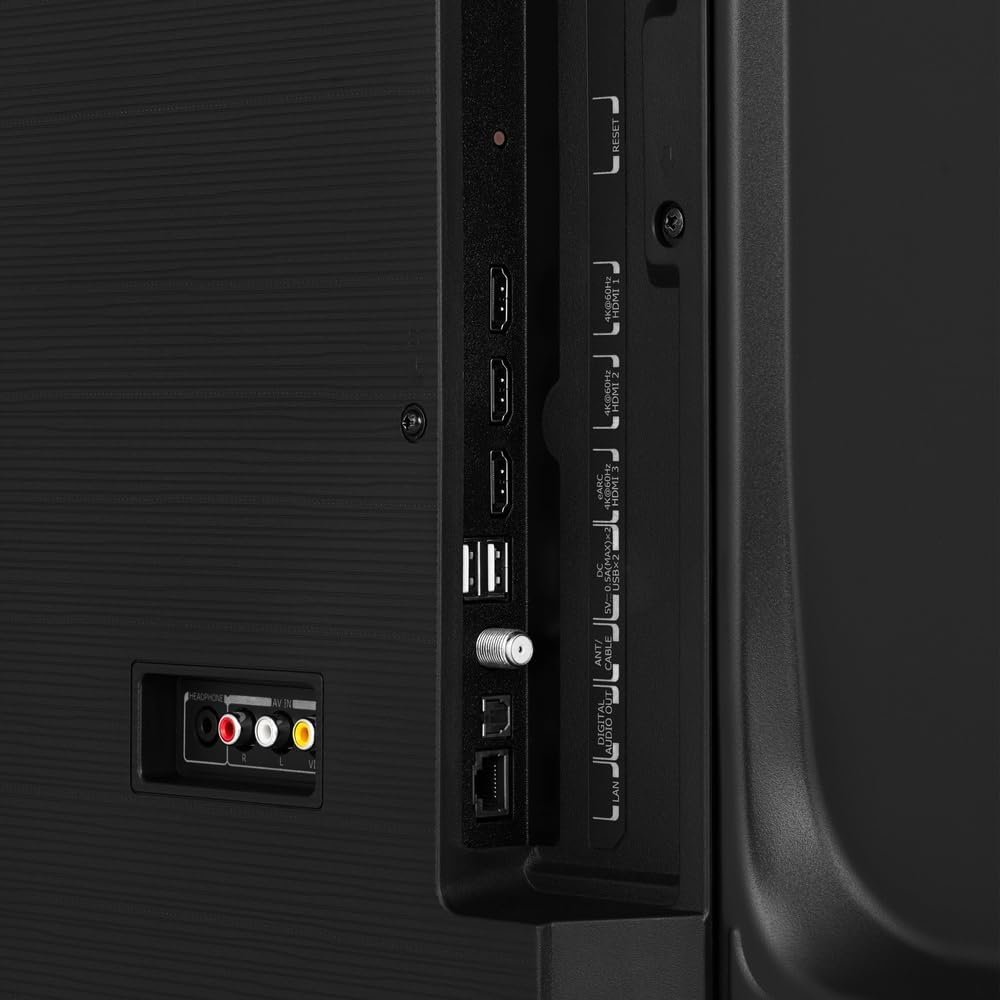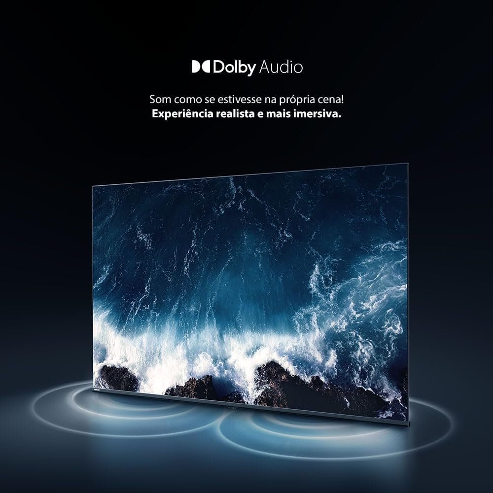 O som é envolvente, com Dolby Audio e Dolby Vision Atmos, e dois alto-falantes de 8W RMS (16W RMS total). Conta com espelhamento de tela, controle parental e múltiplas conexões (3x HDMI 2.0, 2x USB 2.0, AV, P2, óptica, conversor digital e LAN Ethernet). Produto com acesso à internet, requer supervisão parental. Imagens meramente ilustrativas.