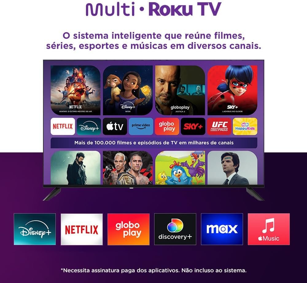 Multi Roku TV 50″ Smart 4K oferece uma tela DLED de 50″ com resolução 4K HDR, proporcionando cores vibrantes e detalhes nítidos. A navegação é simplificada, com botões dedicados no controle remoto para Netflix, Apple TV, Prime Video e Globoplay, além de controle via smartphone e comando de voz pelo app Roku. A TV permite acesso a diversos serviços de streaming, como Netflix, Disney+, Globoplay, Paramount+ e outros.