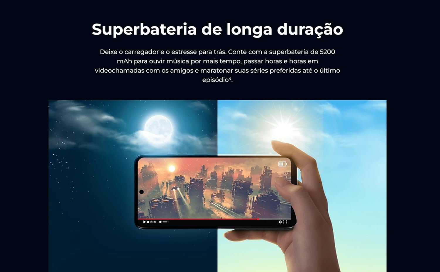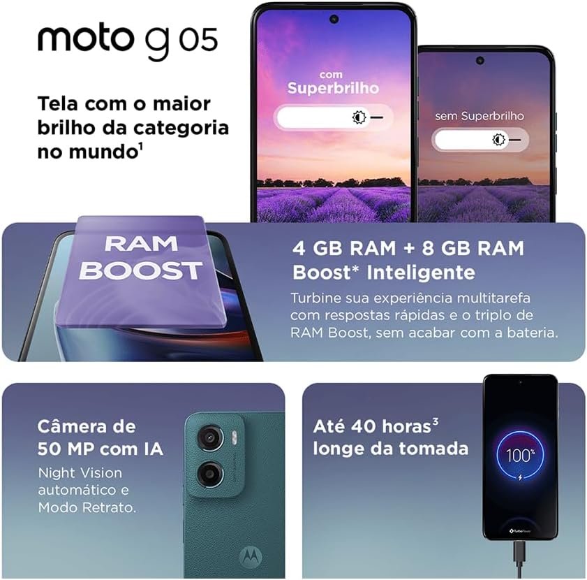Com o moto g05, aproveite a tela de 6,7” com o maior brilho da categoria¹ no mundo (até 1000 nits), oferecendo clareza mesmo sob luz direta do sol. O desempenho é potente, com até 12 GB (4 GB RAM + 8 GB RAM Boost³ Inteligente), garantindo multitarefa rápida sem travamentos. A câmera de 50 MP com inteligência artificial e Night Vision automático captura fotos nítidas e retratos vibrantes, inclusive à noite. A superbateria de 5200 mAh oferece até 40 horas⁴ de uso.