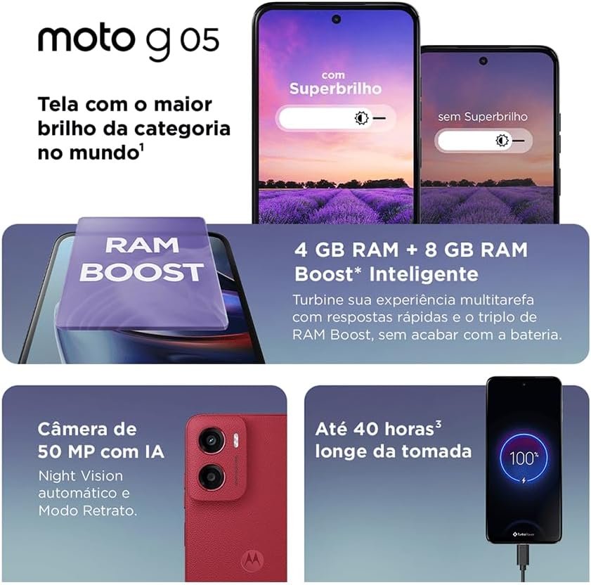 O moto g05 possui tela de 6,7” com brilho de até 1000 nits, desempenho com até 12 GB de RAM, câmera de 50 MP com inteligência artificial e Night Vision, bateria de 5200 mAh com até 40 horas de uso, além de design com acabamento em Vegan Leather, resistência a respingos d’água e vidro Corning Gorilla Glass 3.
