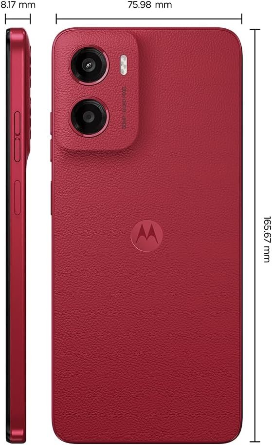 Moto g05 possui tela de 6,7” com brilho de até 1000 nits, visível sob luz solar direta e resposta ao toque molhada. Conta com até 12 GB de memória (4 GB RAM + 8 GB RAM Boost Inteligente) para multitarefa rápida. Câmera de 50 MP com inteligência artificial, Night Vision automático e modo retrato. Bateria de 5200 mAh oferece até 40 horas de uso. Design com acabamento em Vegan Leather, resistência a respingos d’água e vidro Corning Gorilla Glass 3.