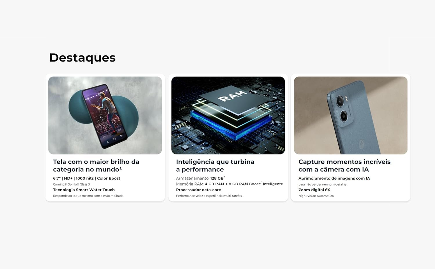 O design sofisticado em Vegan Leather, a proteção contra respingos d’água⁵ e o vidro Corning® Gorilla® Glass 3 garantem resistência e estilo. A tela responde ao toque mesmo molhada e o Modo de brilho máximo permite visualização clara em ambientes externos. O triplo de RAM Boost³ turbina a experiência multitarefa sem comprometer a bateria.
