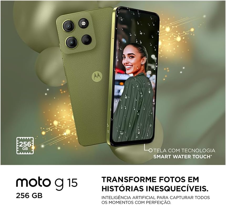O moto g15 possui câmera de 50 MP com inteligência artificial, Night Vision automático e lente ultra-wide. Conta com tela FHD+ de 6,7” com alto brilho, processador octa-core e até 12 GB de memória com RAM Boost. A bateria de 5200 mAh oferece até 40 horas de uso e carregamento rápido. O acabamento inclui Vegan Leather e proteção Corning Gorilla Glass.
