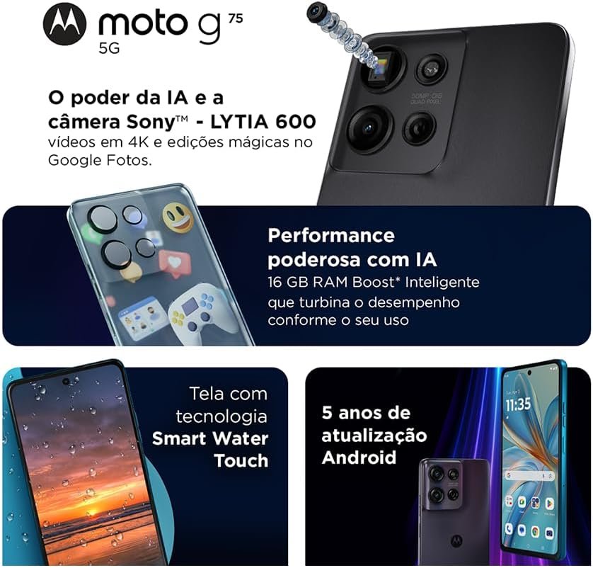 O Moto G75 5G é o primeiro modelo da linha com ultrarresistência militar MIL STD 810H, passando por 16 testes rigorosos que avaliam durabilidade em condições extremas, quedas e submersão em água. Suporta temperaturas de até 70°C em ambientes úmidos, -20°C no frio, variações térmicas bruscas, chuva, umidade, maresia e funciona até 4,5 km de altitude. Conta com câmera de 50 MP com sensor Sony – LYTIA 600, grava vídeos em 4K e possui recursos de inteligência artificial para fotos em qualquer iluminação, incluindo modo Night Vision.