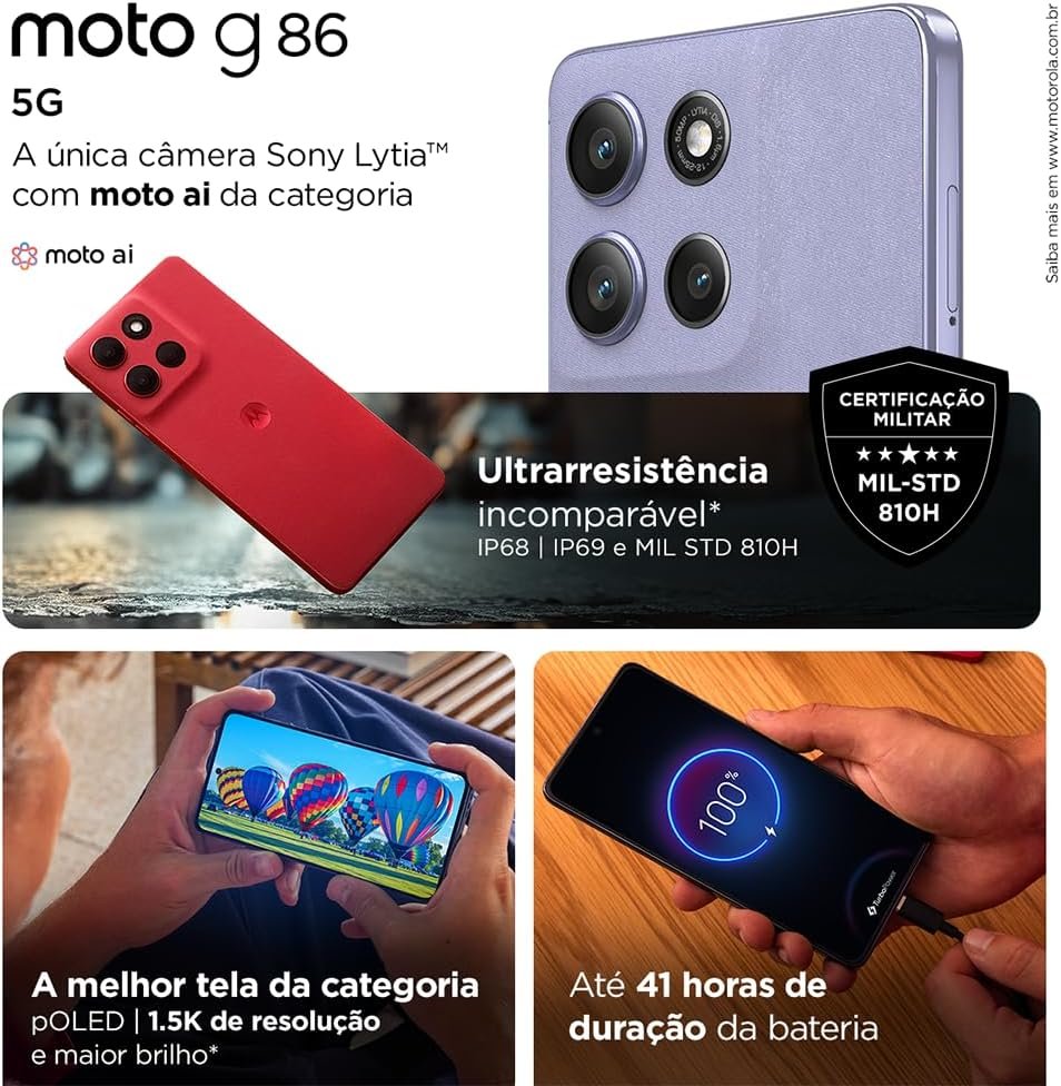 A melhor tela da categoria, com resolução 1.5K e maior brilho*. A única câmera Sony LYTIA™ com moto AI da categoria. Ultrarresistência incomparável: IP68, IP69 e MIL-STD. Circule para pesquisar: agora no moto g. A melhor câmera frontal da categoria.