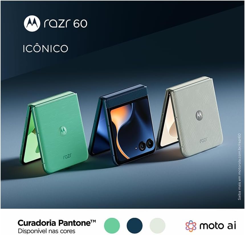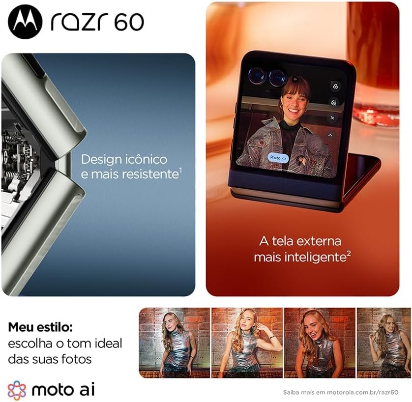 O design dobrável ultracompacto conta com placa de dobradiça em titânio e cores Pantone. A tela externa permite usar apps sem abrir o telefone. O sistema moto ai integra recursos para fotos e vídeos profissionais. A tela principal LTPO exibe um bilhão de tons, com cores Pantone Validated. O processador oferece desempenho 15% superior ao modelo anterior, facilitando multitarefas.