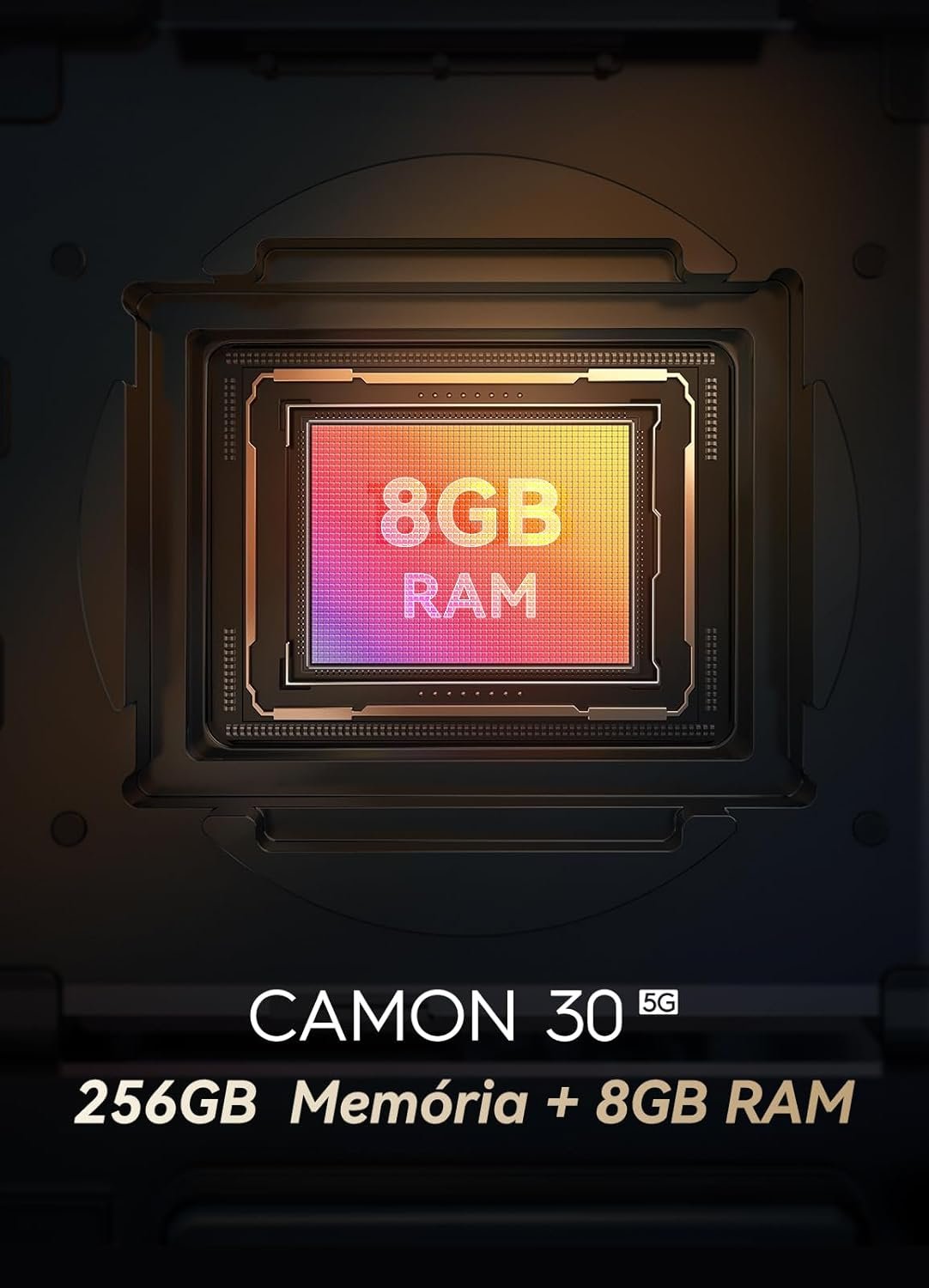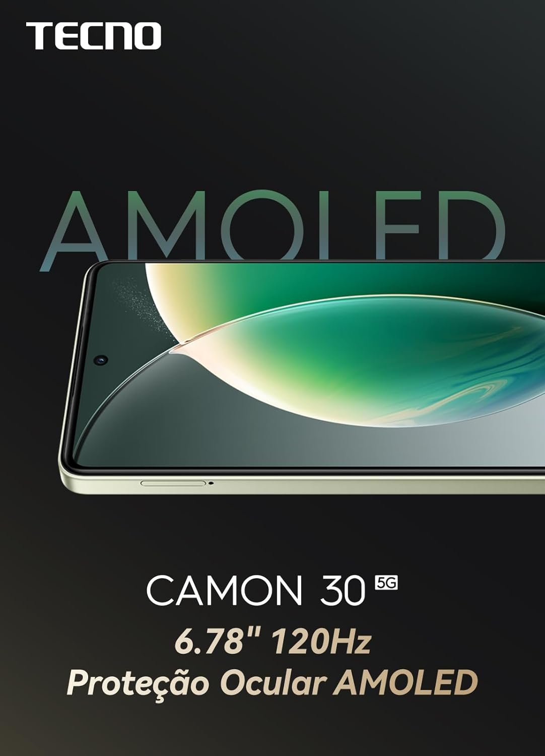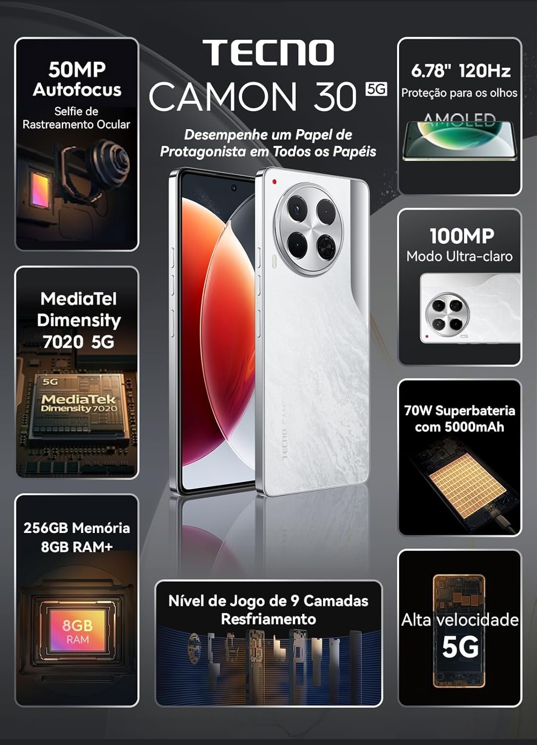 O Tecno Camon 30 possui uma tela AMOLED de 6,78 polegadas com taxa de atualização de 120 Hz, oferecendo efeitos visuais ricos e navegação suave. Equipado com o processador MediaTek Dimensity 7020, 8 GB de RAM e 256 GB de armazenamento, garante desempenho eficiente. A bateria de 5000 mAh proporciona uso prolongado, e o carregador de 70 W permite recarga rápida.