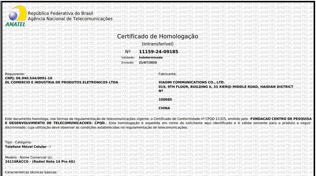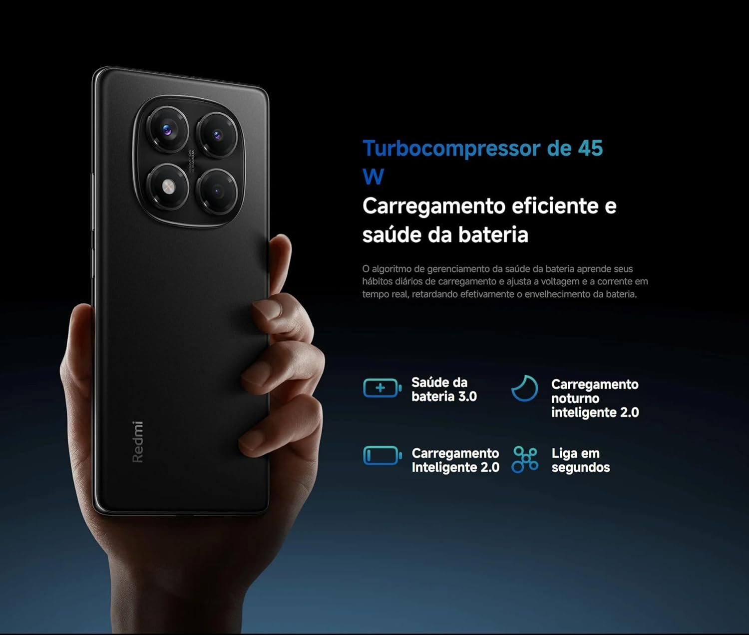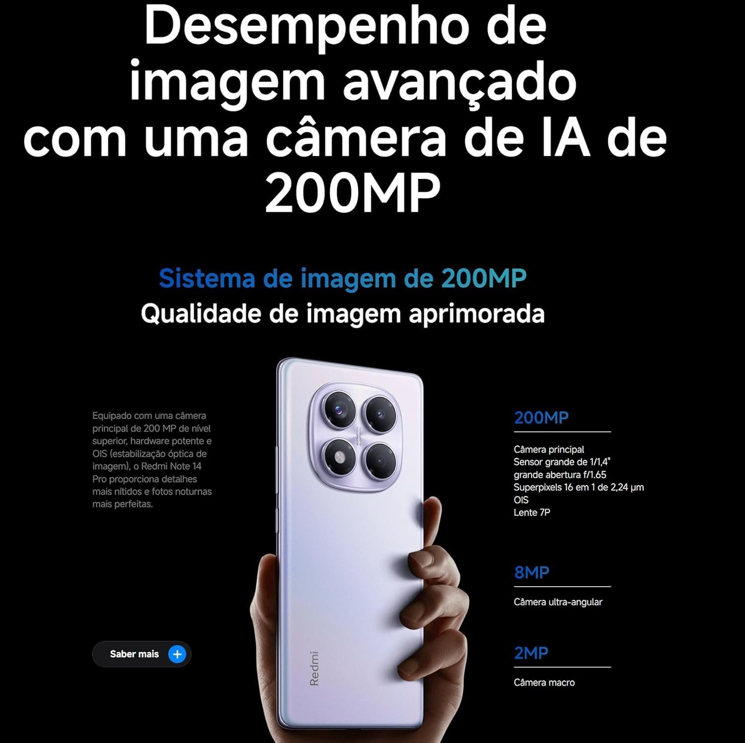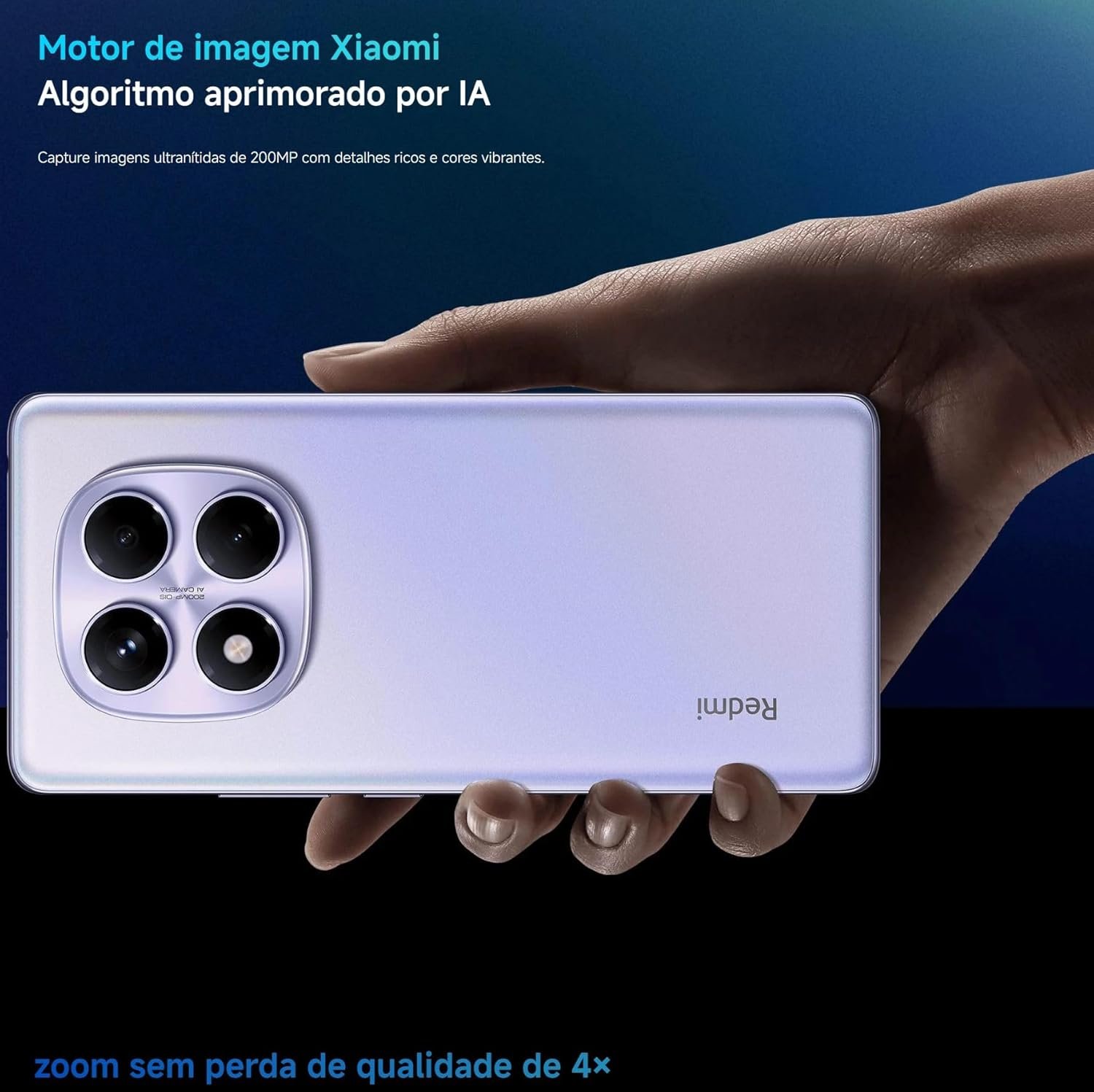 Câmera traseira principal de 200 MP OIS f/1.65, agrupamento 16 em 1, sensor de 1/1,4”, lente 7P; ultra-angular de 8 MP f/2.2. Câmera frontal de 32 MP f/2.2, gravação 1080p/30fps e 720p/30fps. Bateria de 5500 mAh com carregamento turbo de 45 W (carregador incluso). Recursos IA Google Gemini, sensor de impressão digital na tela, desbloqueio facial IA. Rede SIM 1 + híbrido, Bluetooth 5.3, Wi-Fi 802.11a/b/g/n/ac, NFC, navegação por múltiplos sistemas. Áudio com alto-falantes duplos Dolby Atmos e conector 3,5 mm. Sensores diversos. Sistema Xiaomi HyperOS. Conteúdo: celular, adaptador, cabo USB-C, ferramenta SIM, capa, guia e garantia.