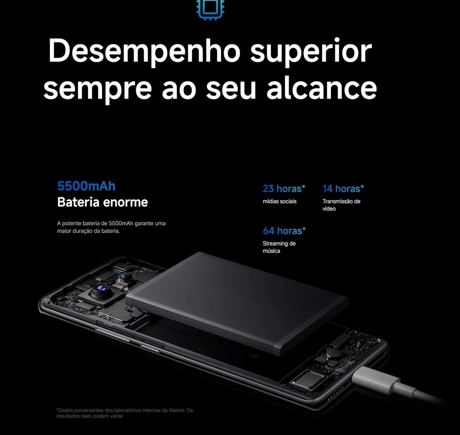 - Bateria de 5500mAh (típico) com carregamento turbo de 45 W, carregador incluído