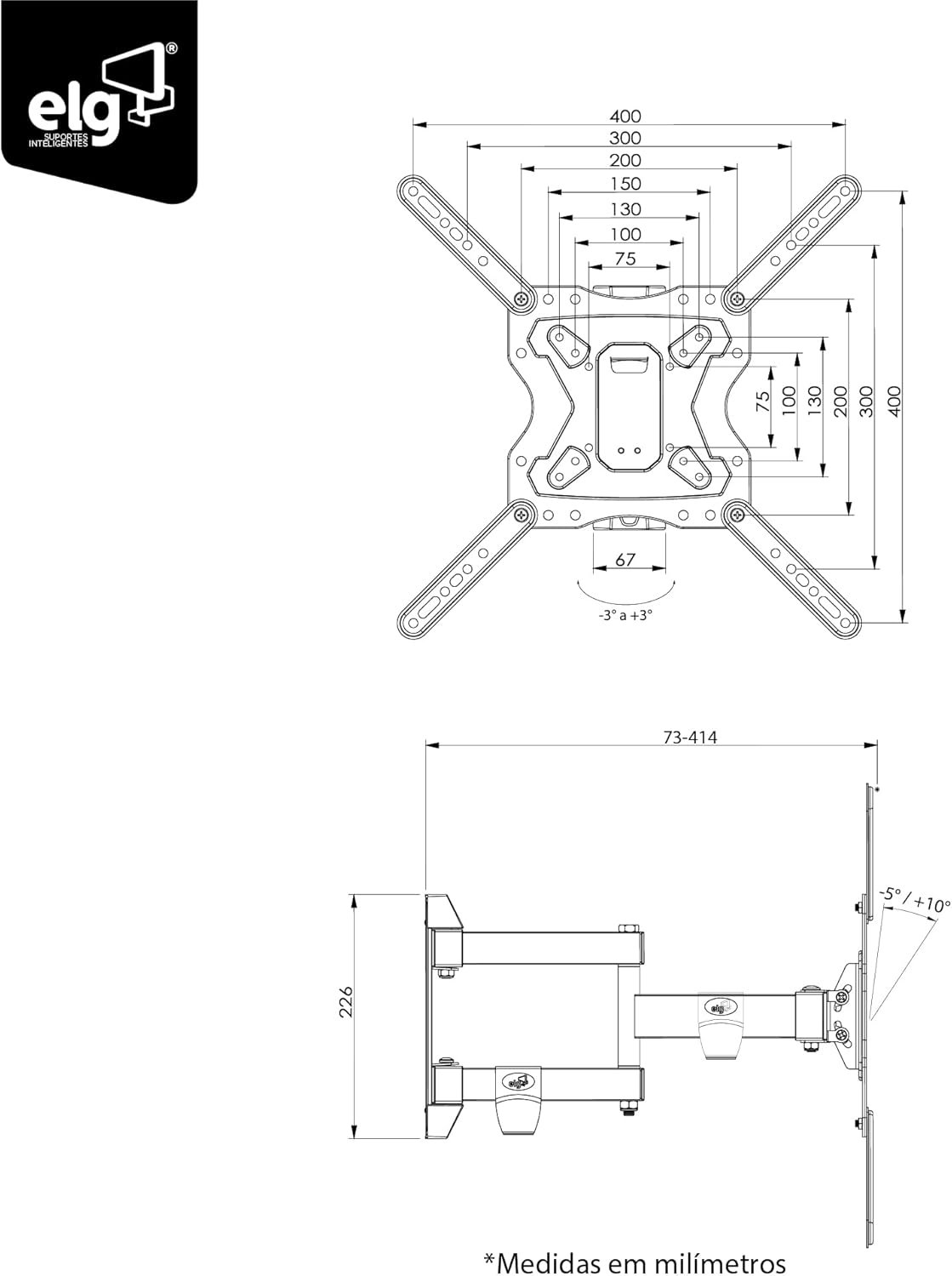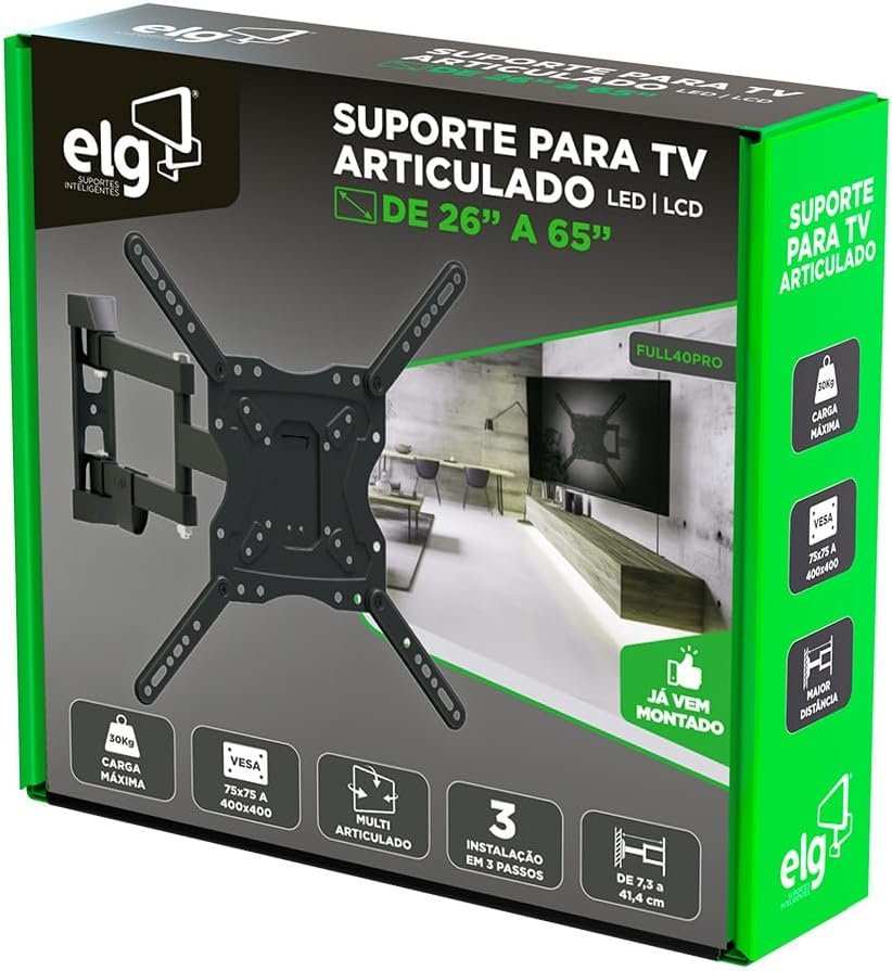 O suporte multiarticulado da ELG é indicado para TVs de 26” a 65” com até 30 kg, compatível com o sistema de montagem VESA de 75×75 até 400×400. Possui afastamento mínimo da parede de 6,5 cm e máximo de 41,4 cm. Permite inclinação vertical de +10° a -5° (TILT), ajuste lateral de +3° a -3° e giro horizontal de até 90°, dependendo do tamanho da TV. A instalação é simples e intuitiva, realizada em apenas três passos. Fabricado em aço carbono com tratamento anticorrosão e pintura epóxi eletrostática, inclui organizador de cabos, nível bolha e capas de acabamento, com garantia de 3 anos.