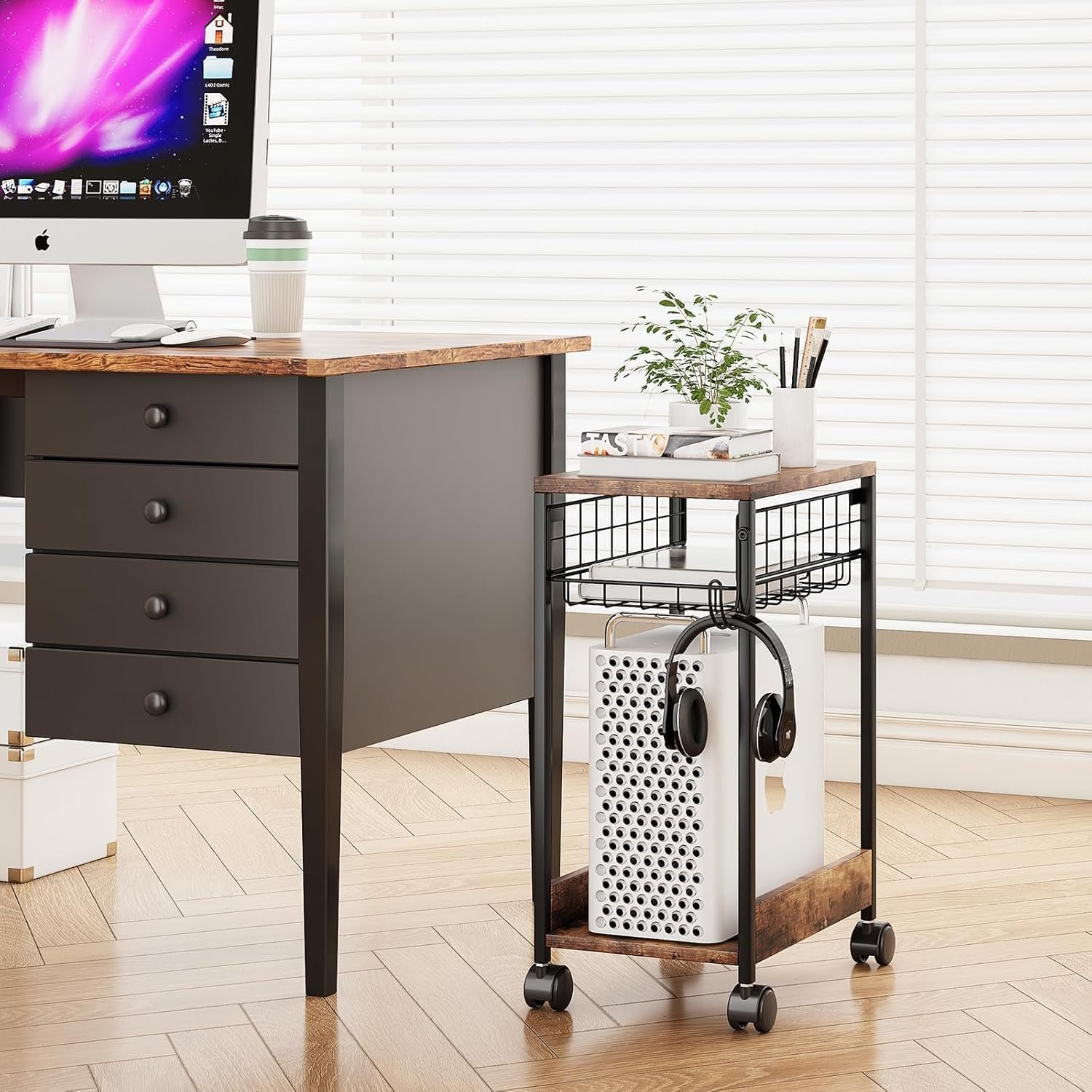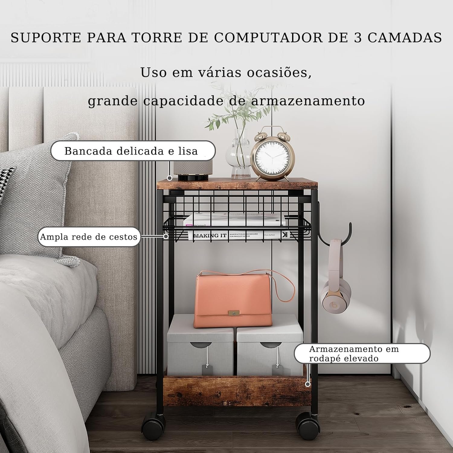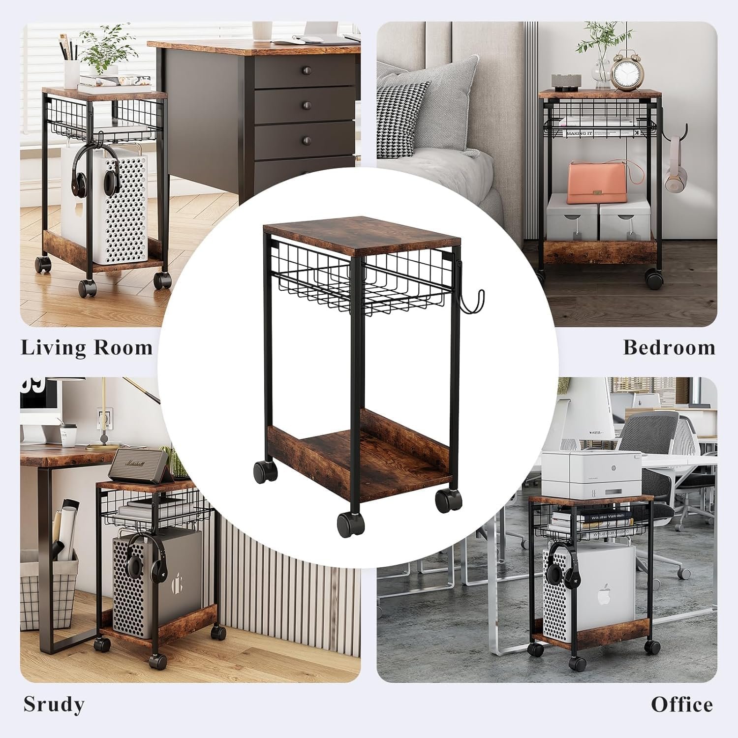 Suporte de torre de computador com área de trabalho espaçosa, capaz de acomodar a maioria das impressoras, máquinas de fax, impressoras 3D, scanners e outros materiais de escritório. Pode ser usado como suporte de impressora para mesas, mesa de café para quartos e salas de estar, além de organizador de desktop para casas e escritórios. O carrinho rolante possui 4 rodízios bloqueáveis para facilitar o movimento e garantir estabilidade, além de um gancho lateral para armazenar sacos de computador e sacos de presente.