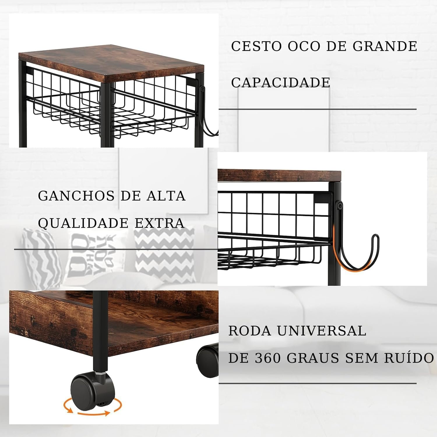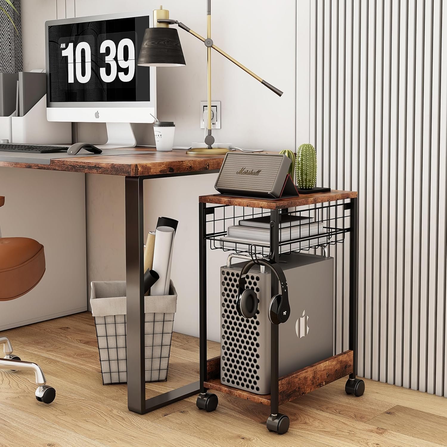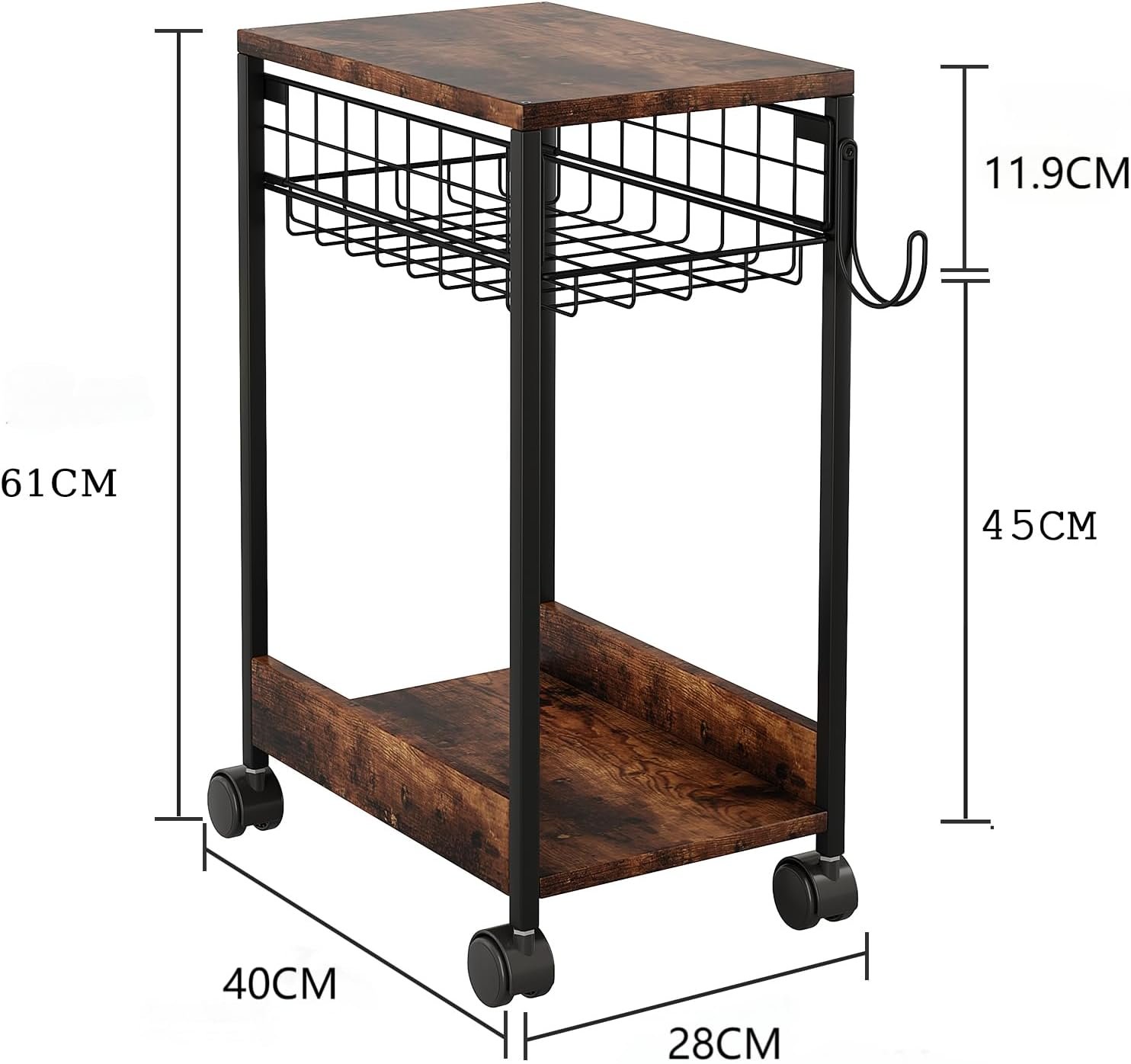 Suporte de torre de computador com área de trabalho espaçosa, capaz de acomodar a maioria das impressoras, máquinas de fax, impressoras 3D, scanners e outros materiais de escritório. Pode ser usado como suporte de impressora para mesas, mesa de café para quartos e salas de estar, além de organizador de desktop para casas e escritórios. O carrinho rolante possui 4 rodízios bloqueáveis para facilitar o movimento e garantir estabilidade, além de um gancho lateral para armazenar sacos de computador e sacos de presente.
